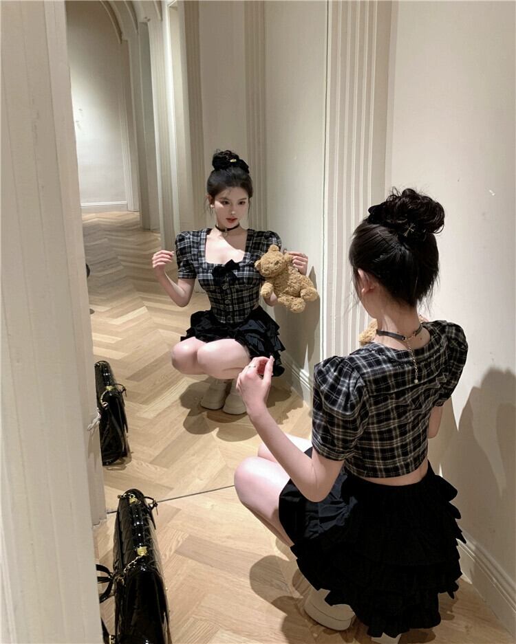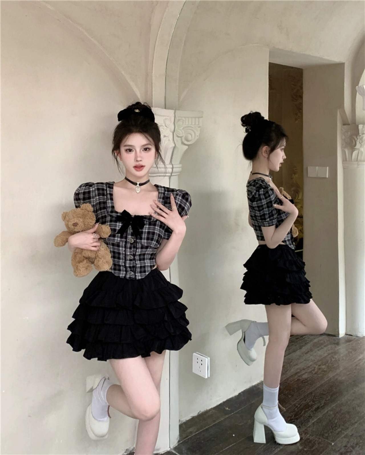 色:黒と白のチェックシャツ,黒スカート