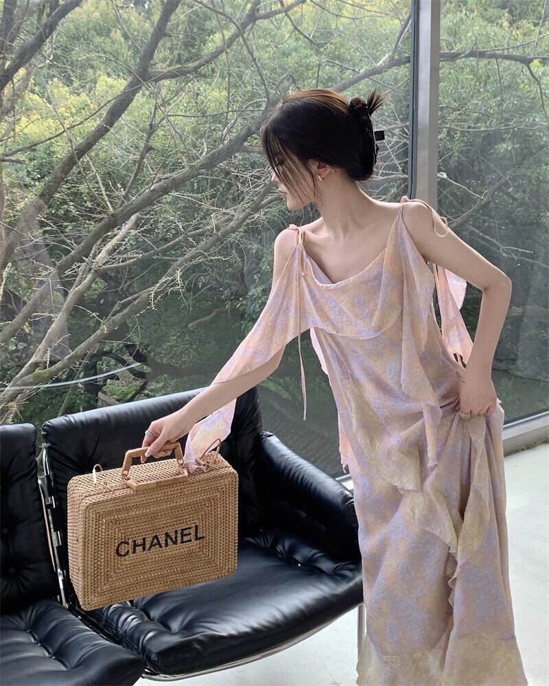 フレンチ V ネックサスペンダードレス女性の夏のカラフルなスカートオフショルダー海辺の休日蓮の葉のエッジ気質ミッドレングススカート サマー 夏物 Vネック bstraw33797360074 | beaute25