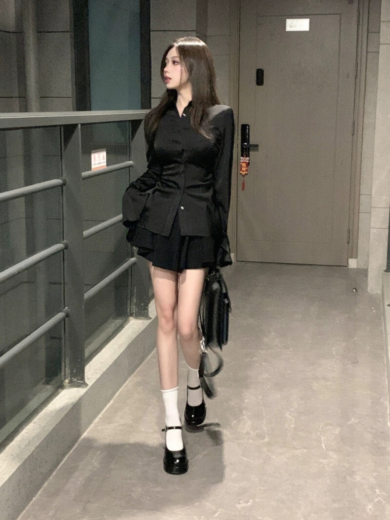 色:黒いシャツ,短いスカート