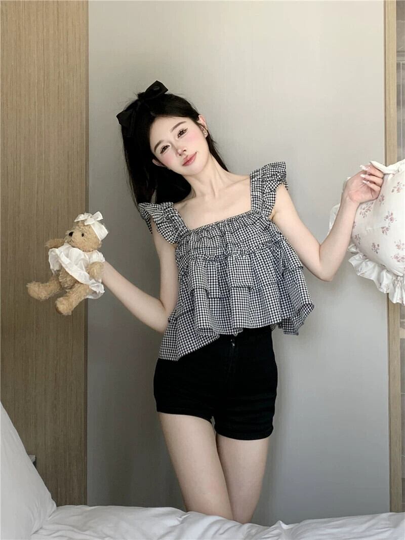 甘いチェック柄スクエアカラーキャミソール女性の夏の純粋な小さなフライングスリーブ蓮の葉のエッジ気質ルーズトップアウター 大人ガーリー スウィート キュート カジュアル サマー 夏物 ピュア スクウェア bstraw54981747794 | beaute25