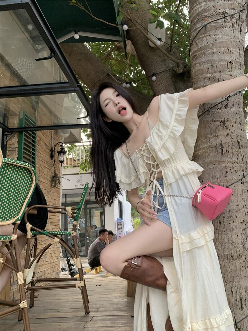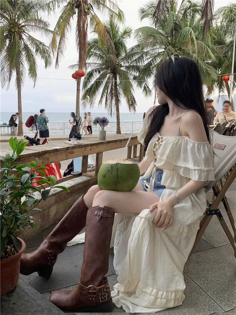 甘いスクエアカラー半袖ドレス女性の夏の海辺の休日のスカートフリル高品質ストラップロングスカート 大人ガーリー スウィート キュート カジュアル サマー 夏物 スクウェア bstraw48974551820 | beaute25