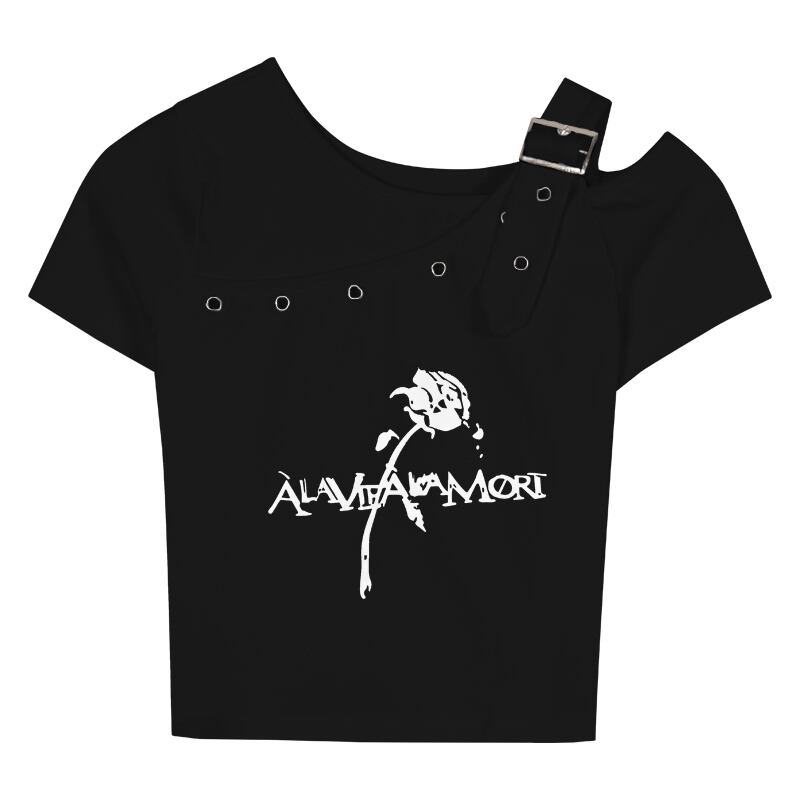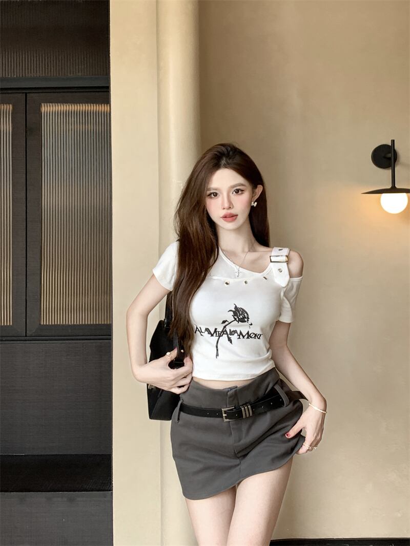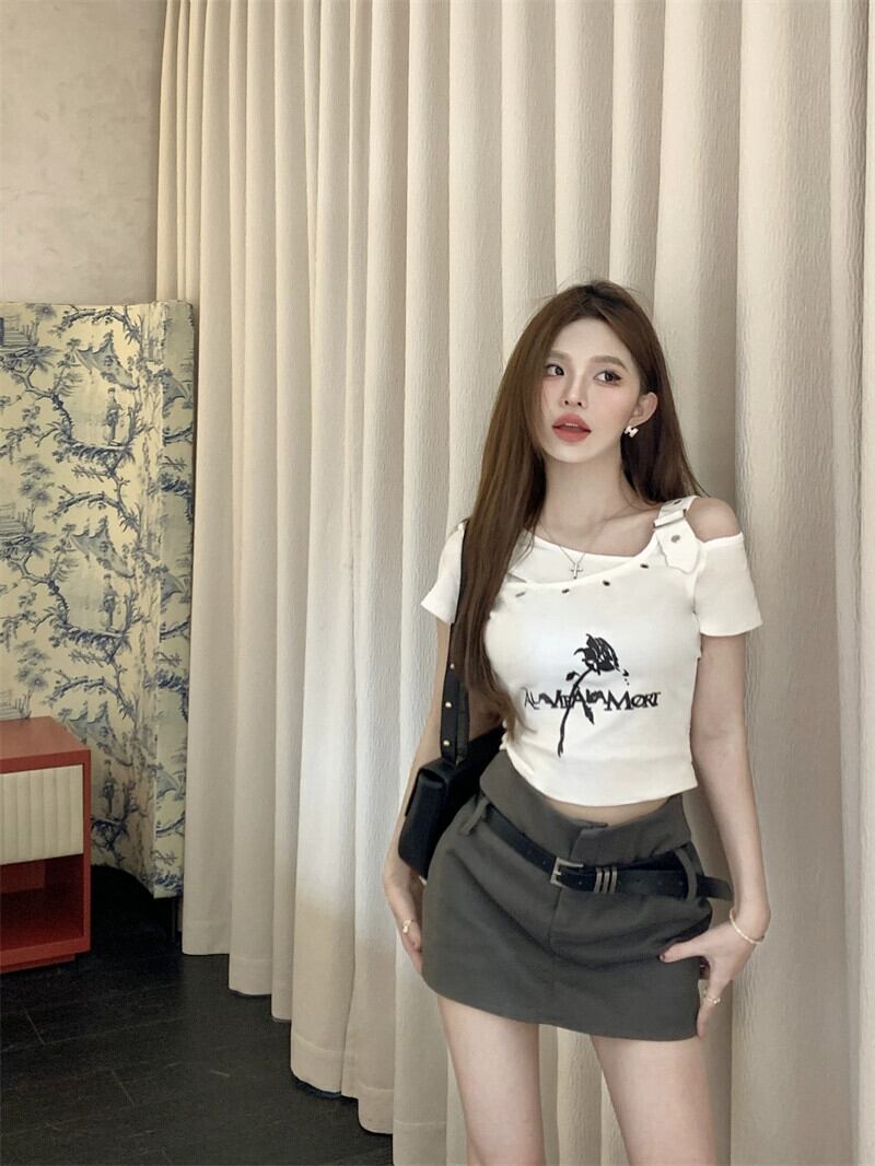 斜め肩白プリント半袖 Tシャツレディース夏スリムショートシックニッチスイートスパイスガールトップ ホワイト 大人ガーリー スウィート キュート カジュアル サマー 夏物 bstraw50075762959 | beaute25