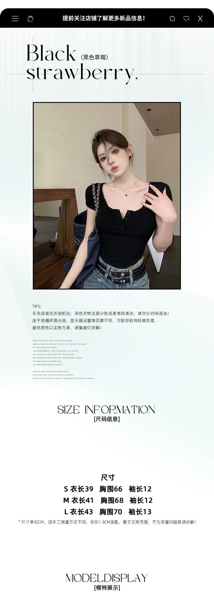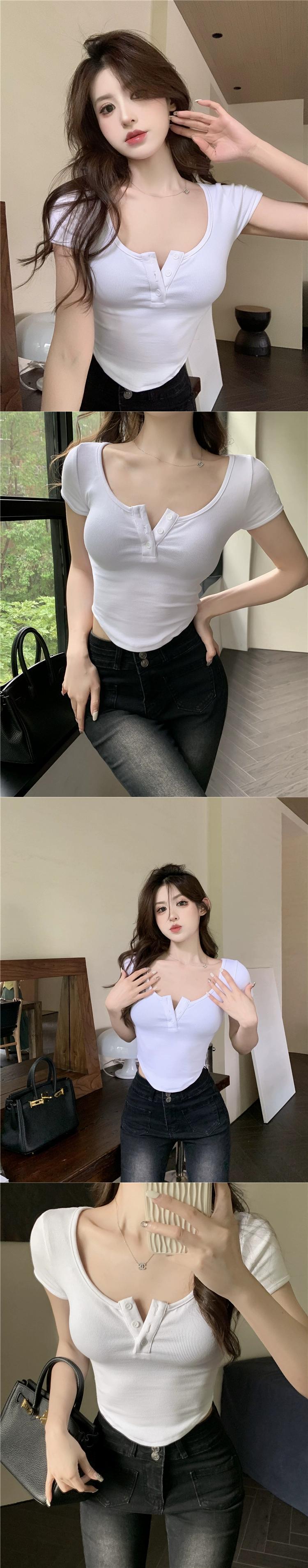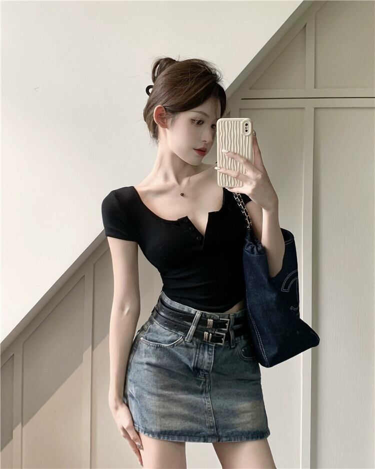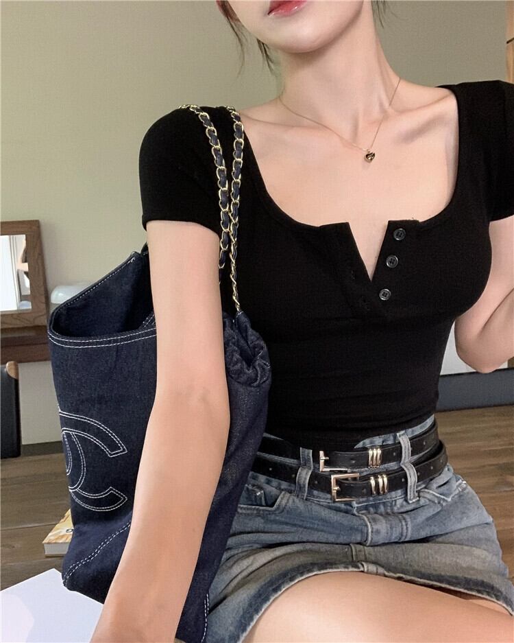 センスニッチ U ネック半袖 T シャツレディース 2023 夏の新作不規則な黒のタイトフィットショートトップ ブラック サマー 夏物 Tシャツ bstraw80982162276 | beaute25