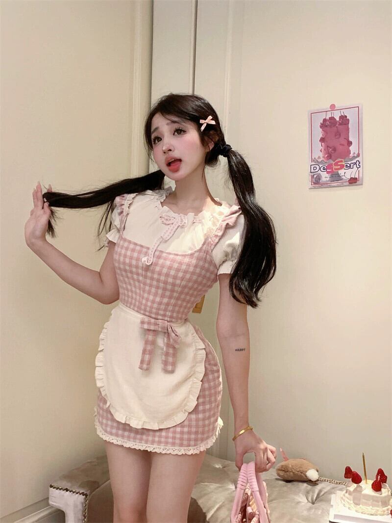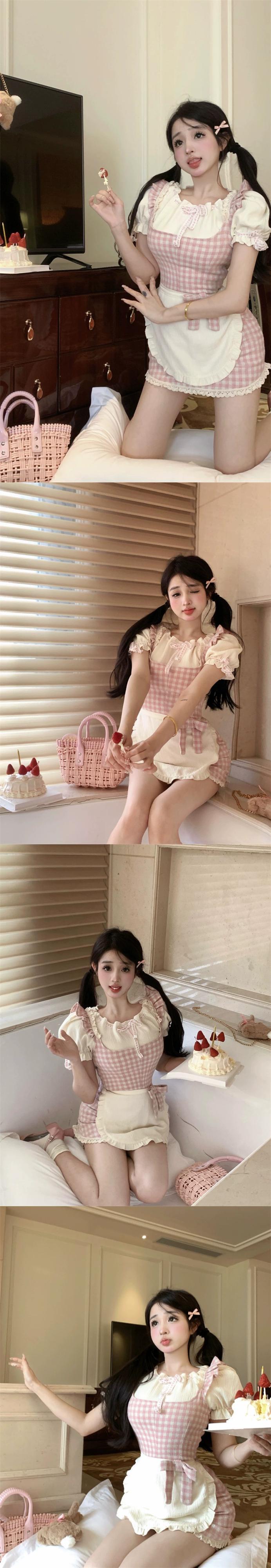 甘いチェック柄サスペンダードレス女性の夏のスカート牧歌的なスタイルスクエアカラーセクシーなバッグヒップスカートショートスカートツーピースセット 大人ガーリー スウィート キュート カジュアル サマー 夏物 スクウェア bstraw3966238300 | beaute25