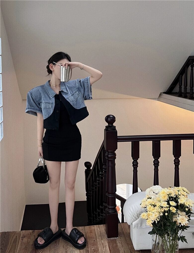 甘くてクールなカラーマッチング半袖デニムジャケットレディース夏デザインセンスニッチルーズショートシックユニークな気質トップ 大人ガーリー スウィート キュート カジュアル サマー 夏物 bstraw15241098647 | beaute25