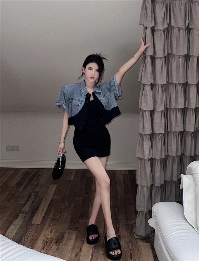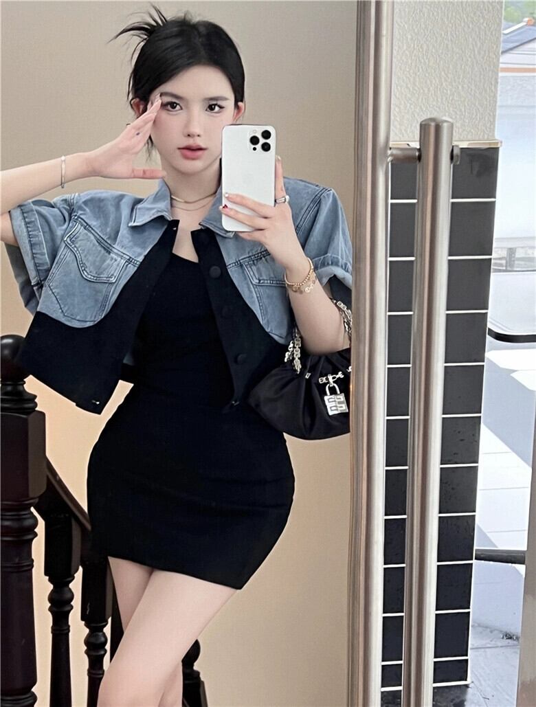 色:黒いドレス,カラーブロックデニムジャケット