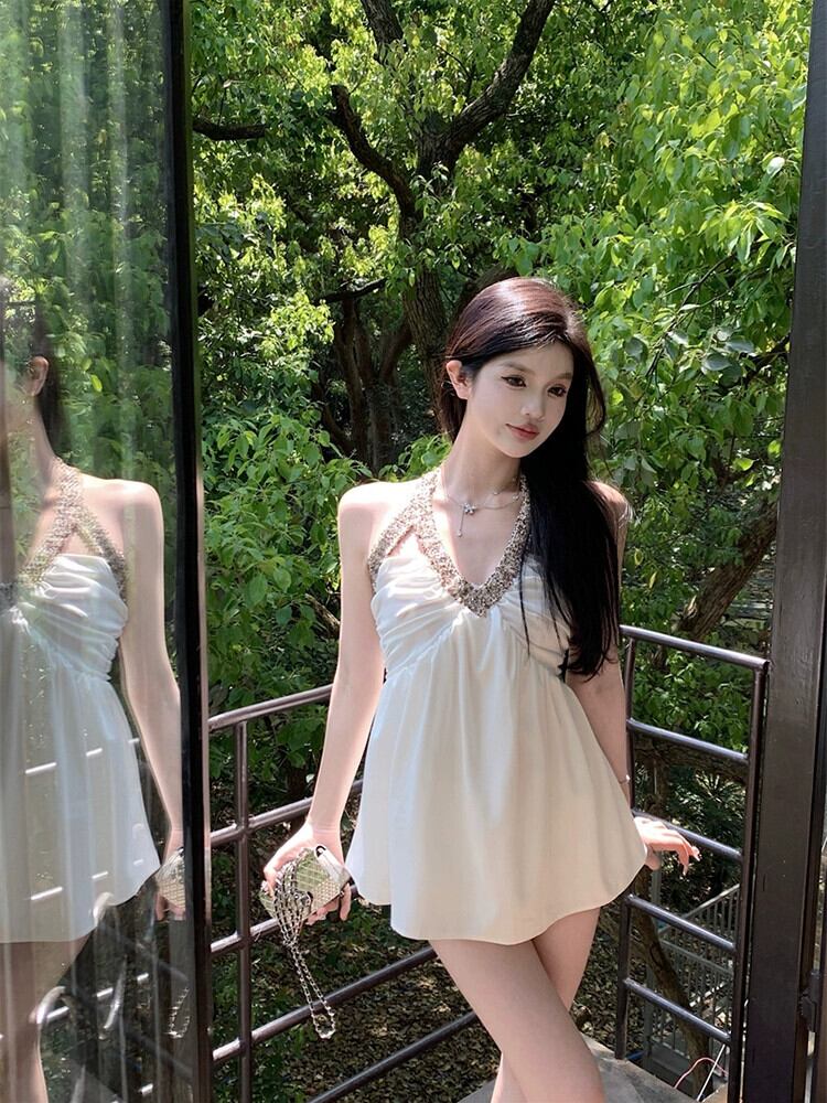 白い吊りネックストラップ小さなベスト女性の夏の V ネック折り目中空ウエストデザイン甘いトップスアウターウェア ホワイト 大人ガーリー スウィート キュート カジュアル サマー 夏物 Vネック bstraw3354780727 | beaute25