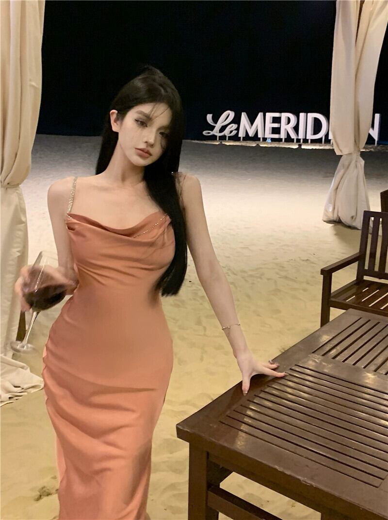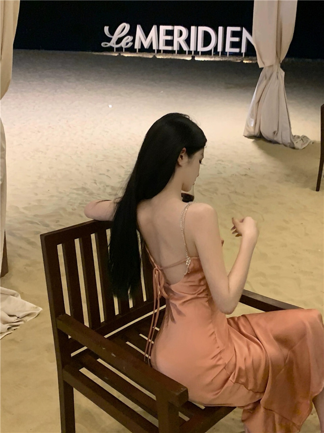 フレンチサテンスパークリングダイヤモンドストラップドレス女性の夏のスカートノースリーブネクタイオープンバックウエストウエストセクシーなミドル丈スカート サマー 夏物 bstraw84712717861 | beaute25
