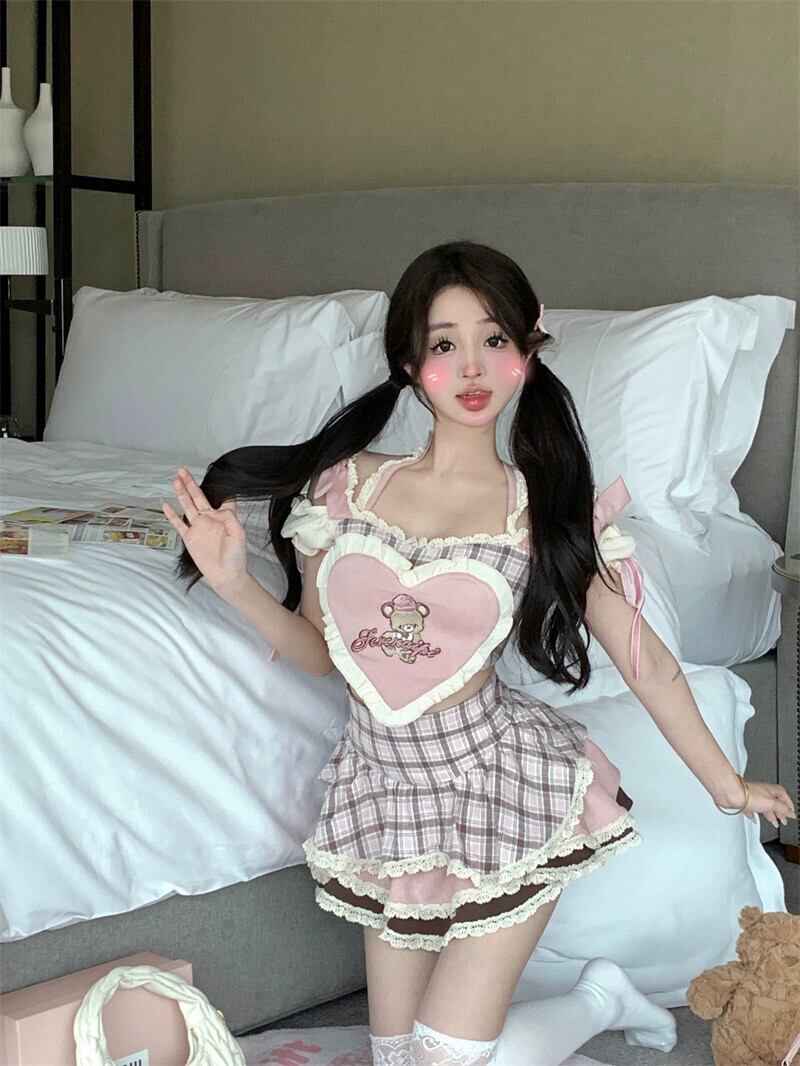甘いチェック柄セクシーなホルターネックキャミソール女性の夏のスーツスカート気質ショートスカートスカート 2 点セット 大人ガーリー スウィート キュート カジュアル サマー 夏物 bstraw69797032336 | beaute25
