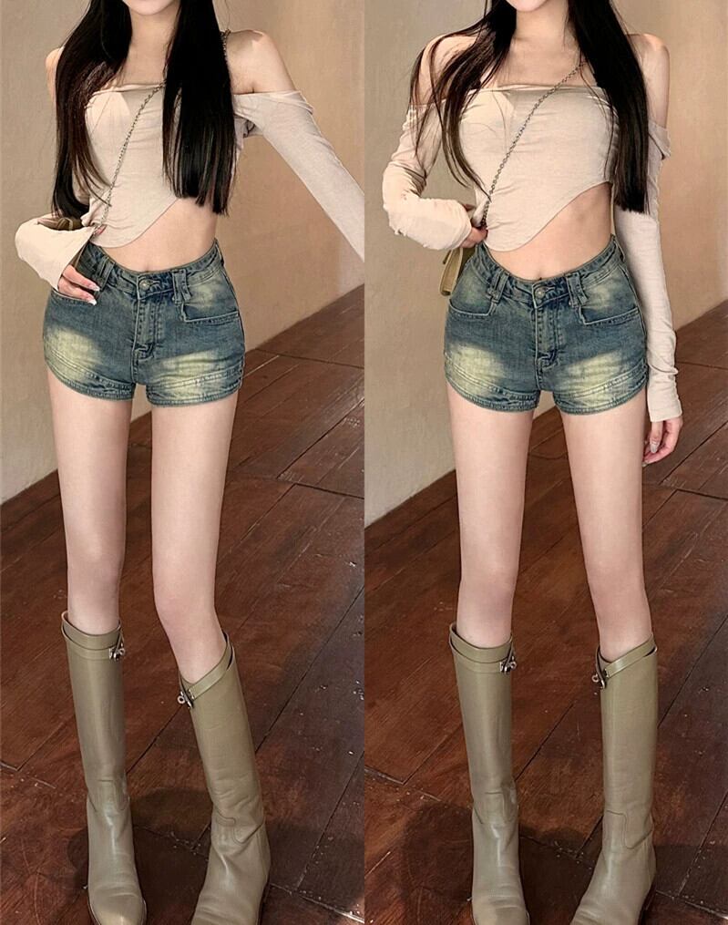 レトロなダメージジーンズ女性の夏のハイウエストショートパンツアメリカンセクシーパンツスキニースリムフィットバッグヒップパンツ ハイウェスト サマー 夏物 ショーツ ブルマー bstraw71862412584 | beaute25
