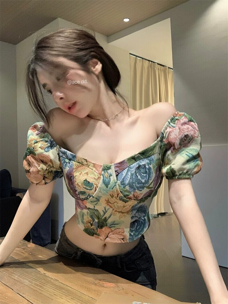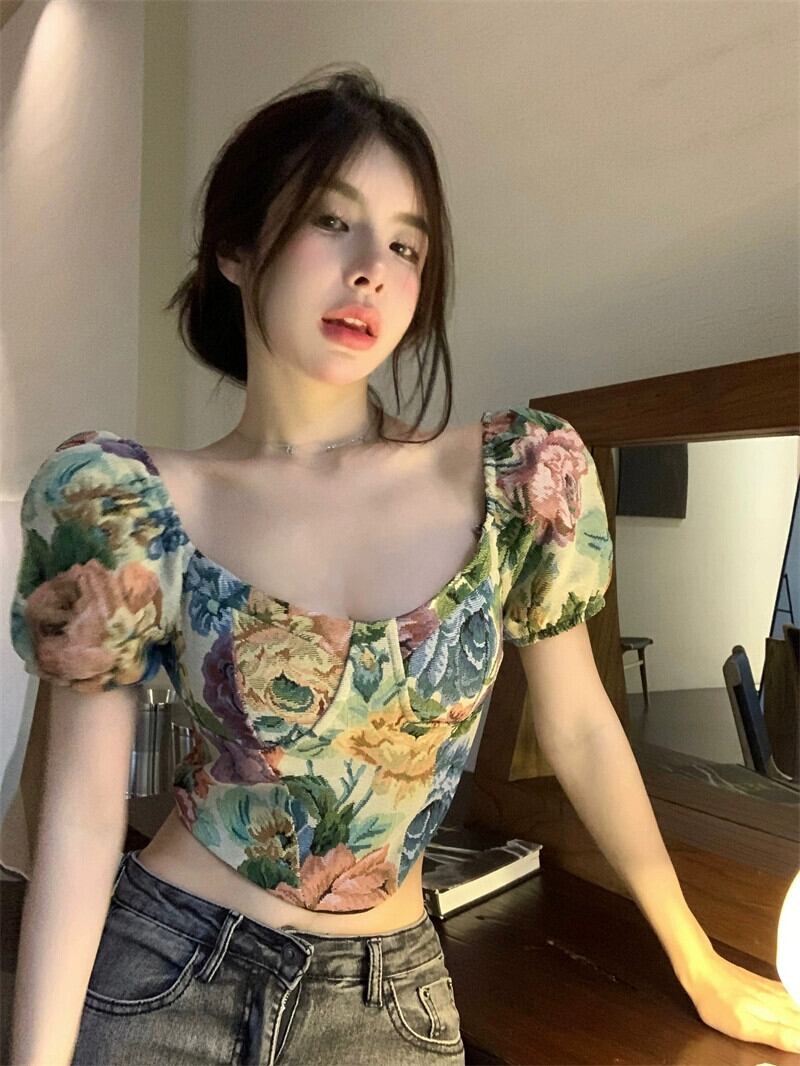 フレンチレトロスクエアカラー花柄パフスリーブTシャツレディース夏自己修養ショートセクション不規則な甘いニッチトップ 大人ガーリー スウィート キュート カジュアル サマー 夏物 スクウェア bstraw73146222578 | beaute25
