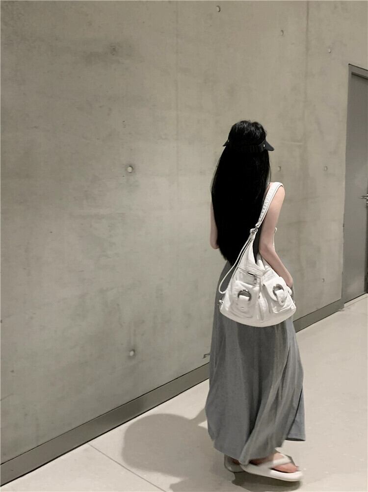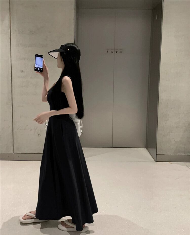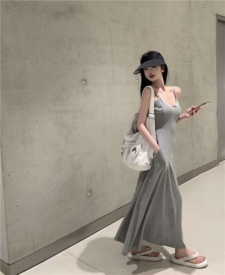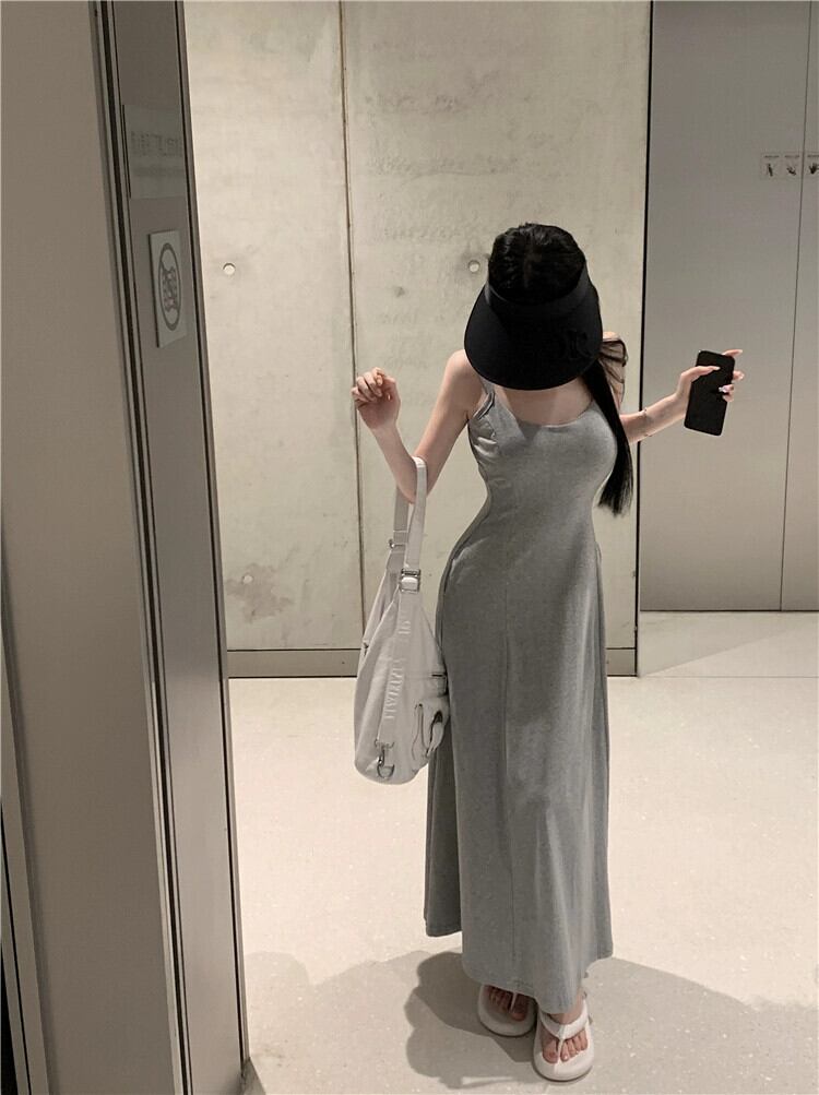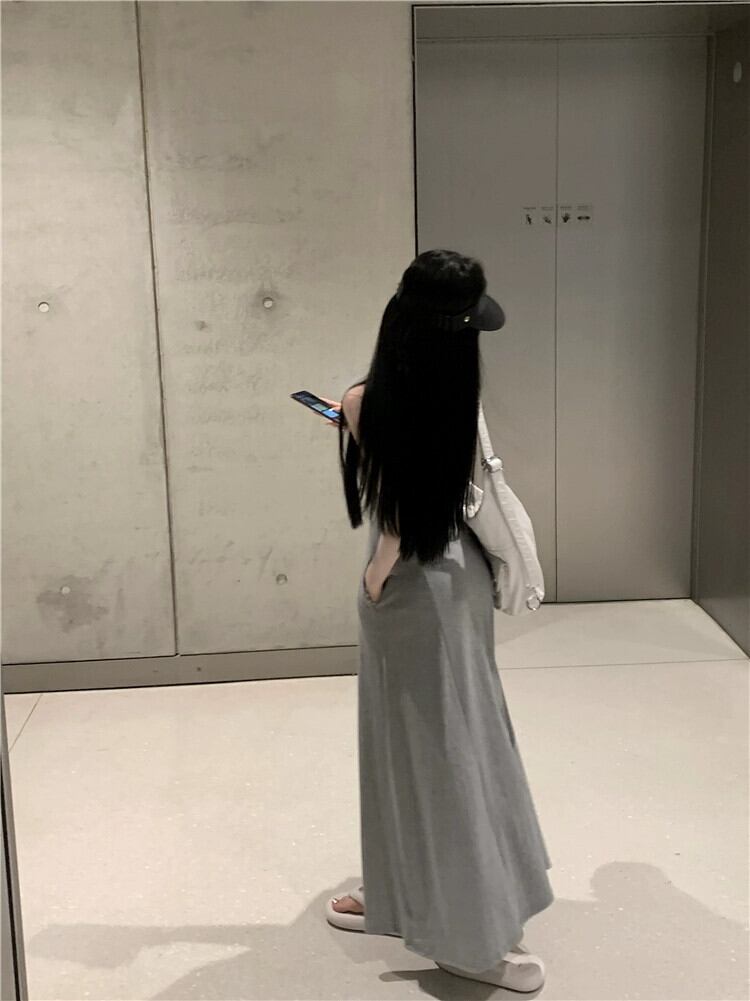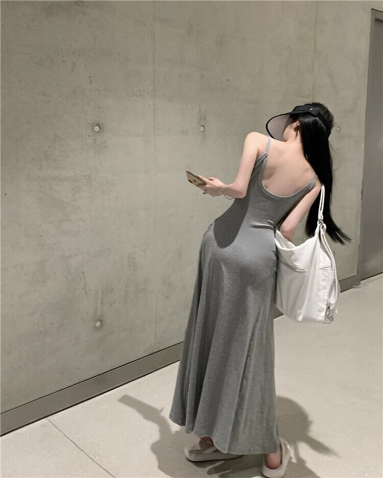 グレー V ネックサスペンダードレスの女性の夏の純粋な欲望風スカート涼感背中の開いた気質ハイエンドロングスカート サマー 夏物 Vネック ピュア bstraw72813098072 | beaute25