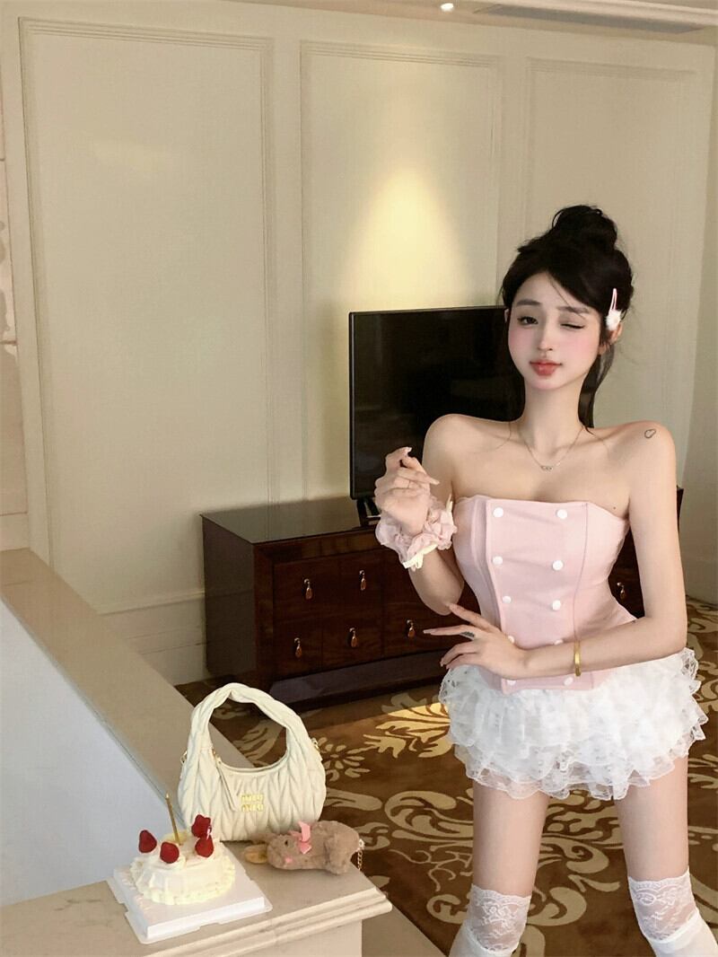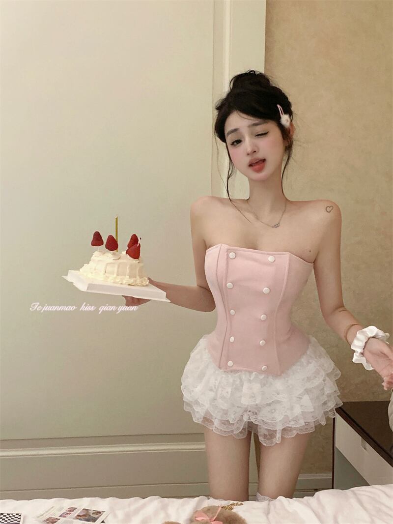 甘いピンクのノースリーブチューブトップ小さなベスト女性の夏のショートスタイル純粋な欲望の女の子セクシーなストラップを着用トップス 大人ガーリー スウィート キュート カジュアル サマー 夏物 ピュア bstraw25291818785 | beaute25