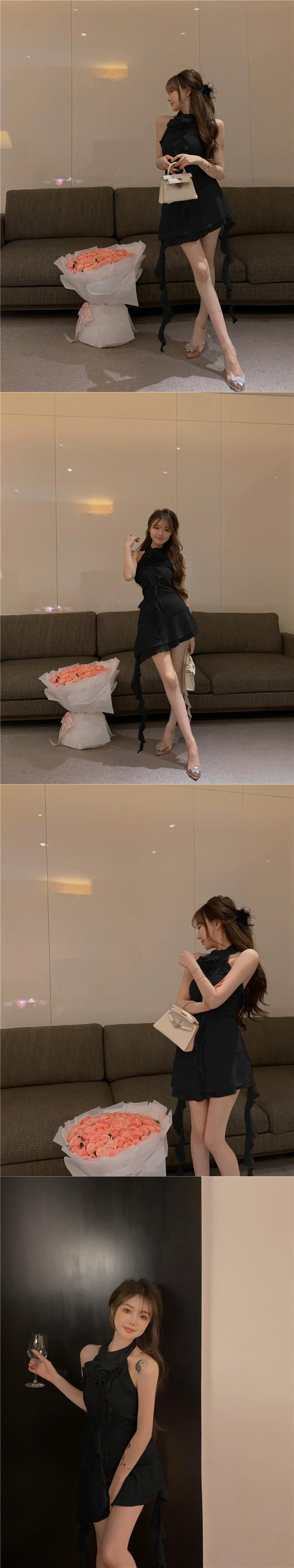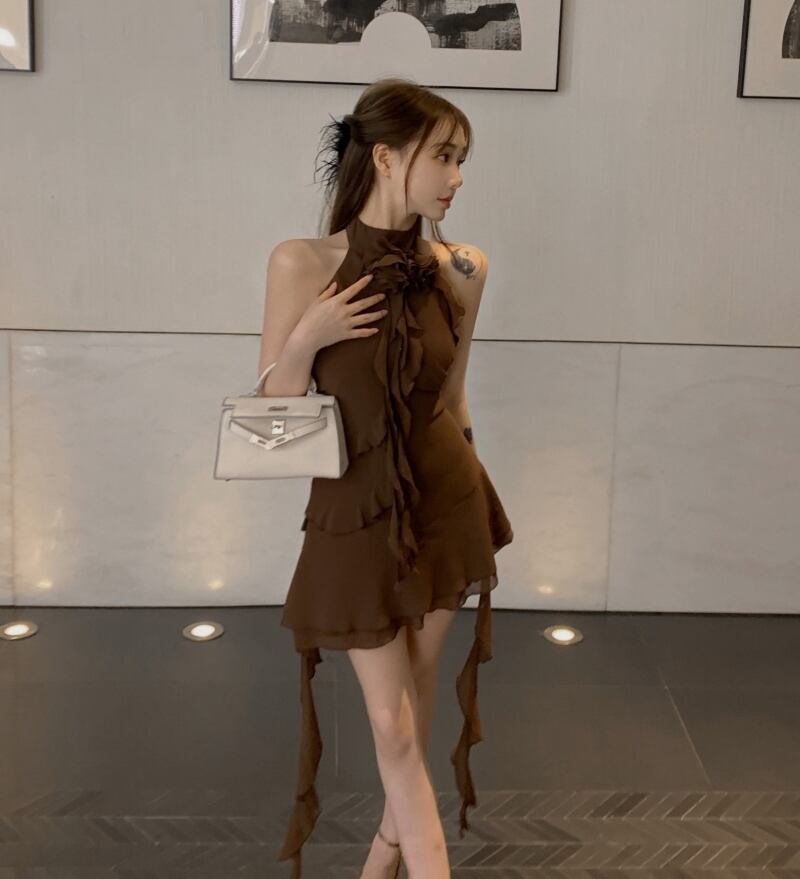 大気ホルターネックシフォンドレス女性の夏の立体フラワーウエストショートスカートフリルリボン A ラインスカート サマー 夏物 Aライン フラワーデザイン bstraw36456813192 | beaute25