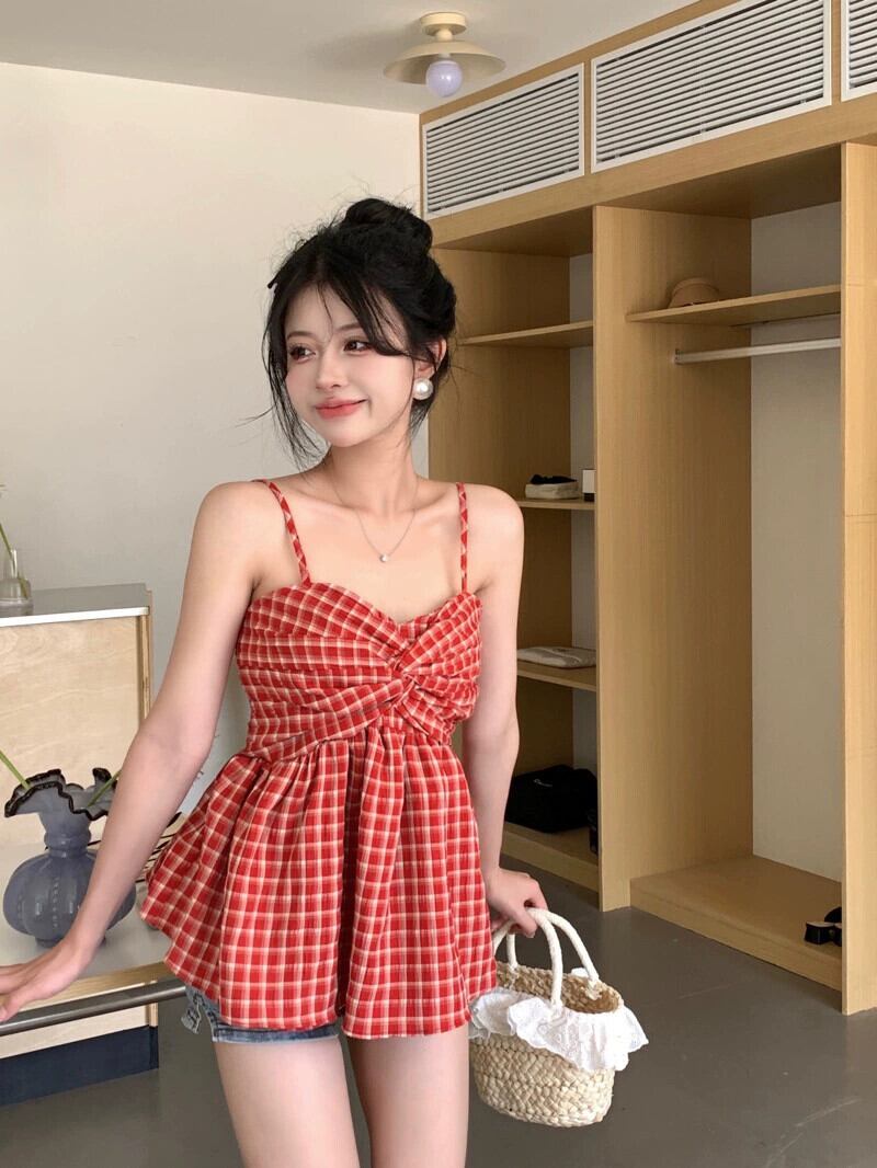 スイート スパイス ガールズ チェック柄キャミソール 小さなベスト 夏フレンチ ピュア ディザイア アウター レッド リボン ホルター ショート トップ 大人ガーリー スウィート キュート カジュアル サマー 夏物 bstraw41199088611 | beaute25