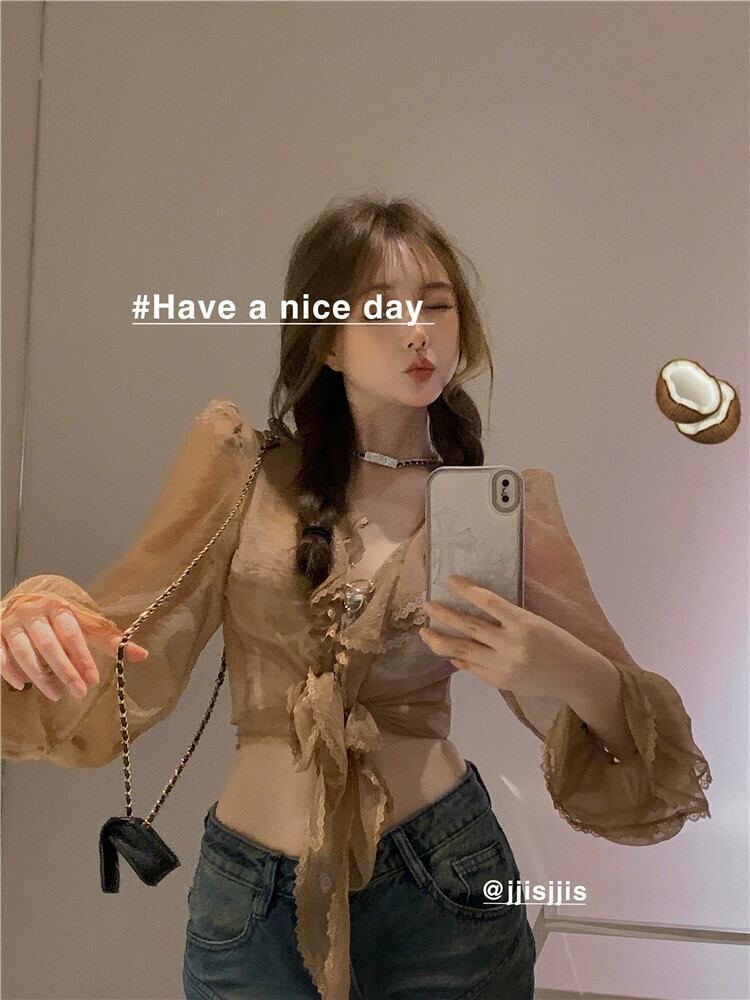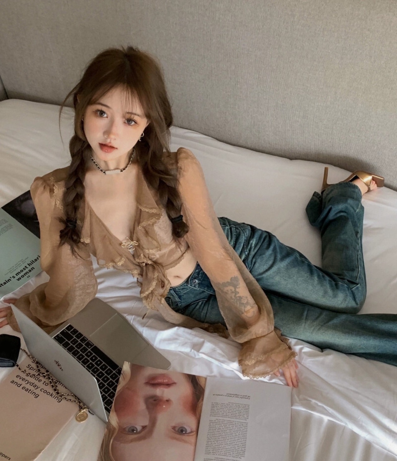 スパイスガールフリル長袖シャツ女性の夏の薄いセクションフレンチシックな日焼け止めブラウスカーディガンレースショートトップ ロング サマー 夏物 bstraw80651862875 | beaute25