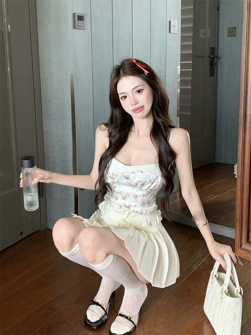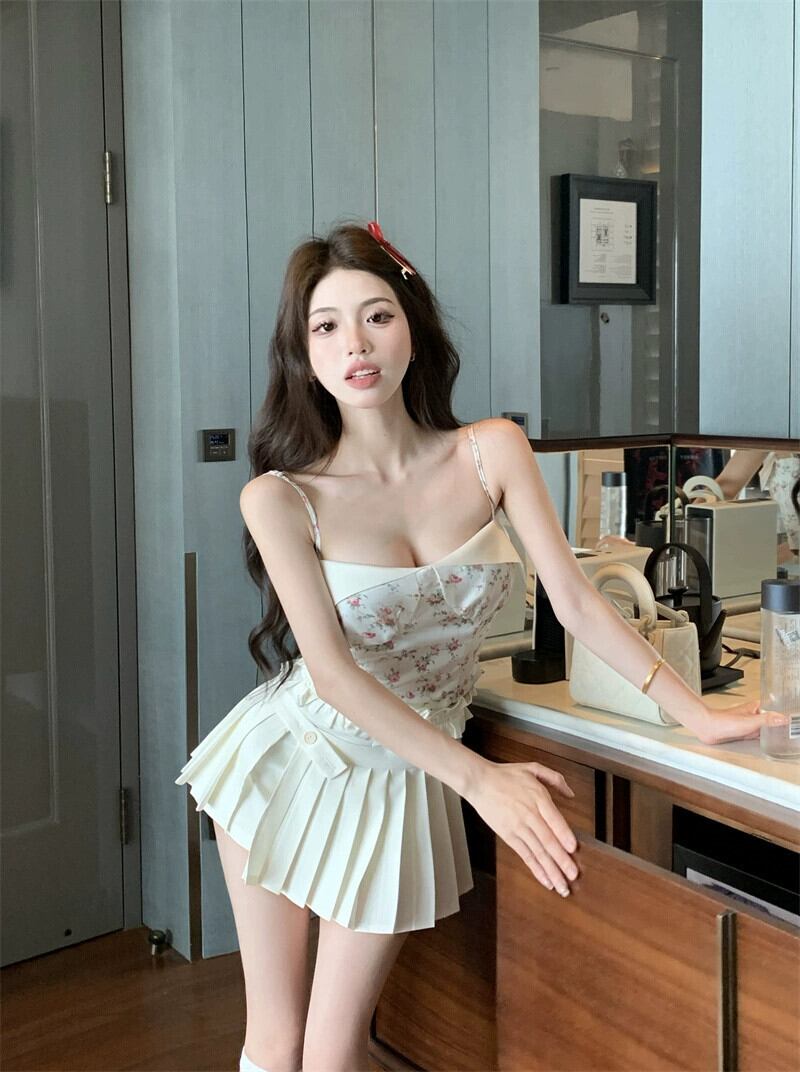 甘い花柄の小さなサスペンダーの女性は、夏には短いノースリーブのセクシーなベストを着て、スリムフィットのホルタートップを着ます ショート 半袖 ハーフスリーブ 大人ガーリー スウィート キュート カジュアル サマー 夏物 bstraw13787811744 | beaute25