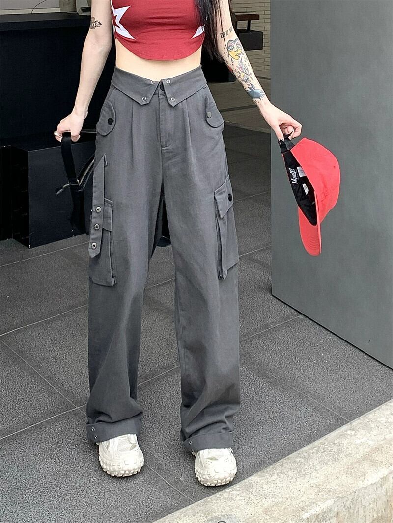 アメリカンデザインセンスボタングレーストレートカジュアルオーバーオールレディース夏薄手ハイウエストゆったりワイドレッグパンツ ハイウェスト サマー 夏物 ワイドパンツ bstraw4313749379 | beaute25