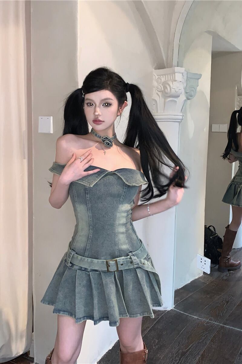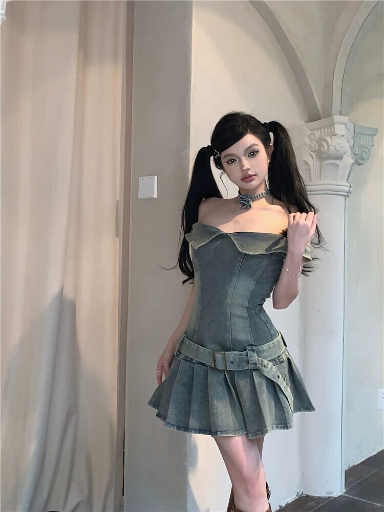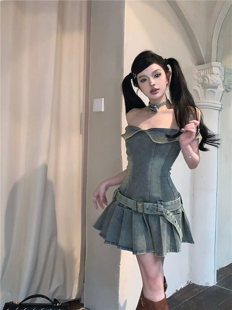ワンショルダーデニムドレスレディース夏スリムレトロプリーツスカートデザインセンスアメリカンベルトチューブトップスカート サマー 夏物 ハーネス bstraw40901322841 | beaute25