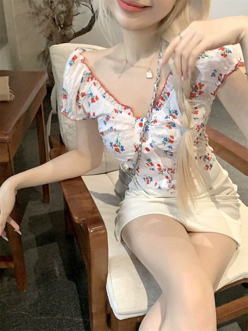 甘い花柄ウッドイヤーサイドショートスリムトップ女性の夏 V ネック半袖ボタンダウン純粋な欲望風ニッチシック T シャツ 大人ガーリー スウィート キュート カジュアル サマー 夏物 Vネック Tシャツ ピュア bstraw6248588092 | beaute25