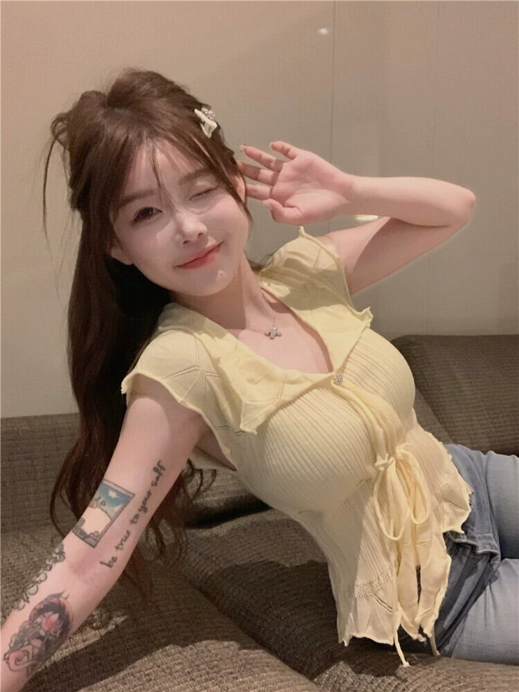 純粋な欲望風ストラップノースリーブ tシャツ女性の夏イエローベストデザインセンスニッチスリムショート v ネックトップ サマー 夏物 Vネック bstraw18929944723 | beaute25