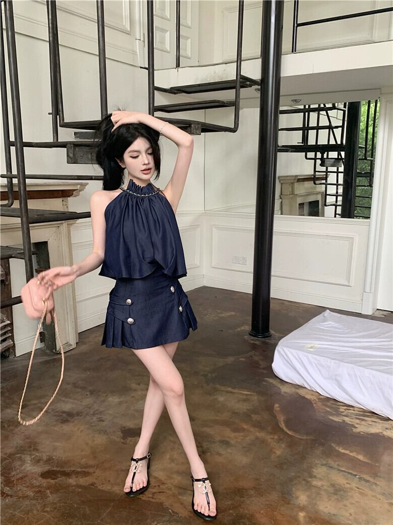 純粋な欲望レトロセクシーなデニムスーツホルターネックシャツ女性の夏甘いクールプリーツスカートスカート 2 点セット 大人ガーリー スウィート キュート カジュアル サマー 夏物 bstraw27009225338 | beaute25