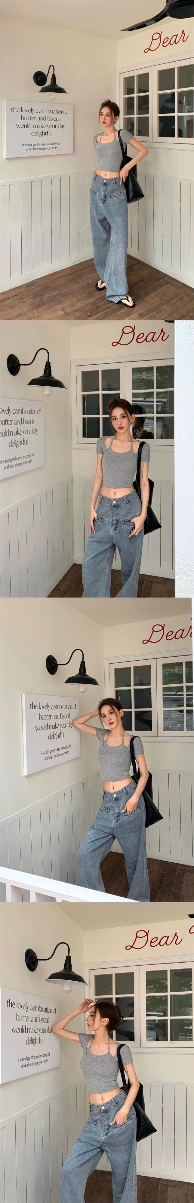 アメリカンスタイルの吊りネックストラップスリムフィットサスペンダー Tシャツ女性の夏のセクシーな偽ツーピースブルーショート鎖骨トップ サマー 夏物 bstraw37133647134 | beaute25