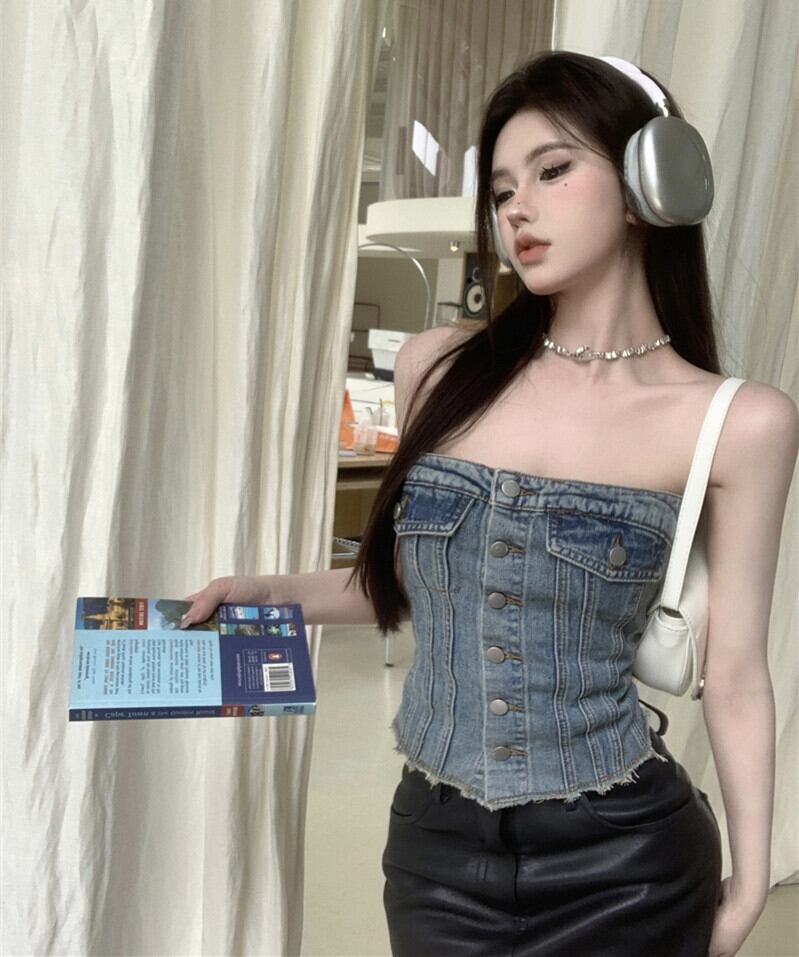 レトロデニムチューブトップベスト女性の夏の自己修養セクシーなインナーウェアバックレスショートセクションニッチトップアウターウェア サマー 夏物 bstraw92393141610 | beaute25