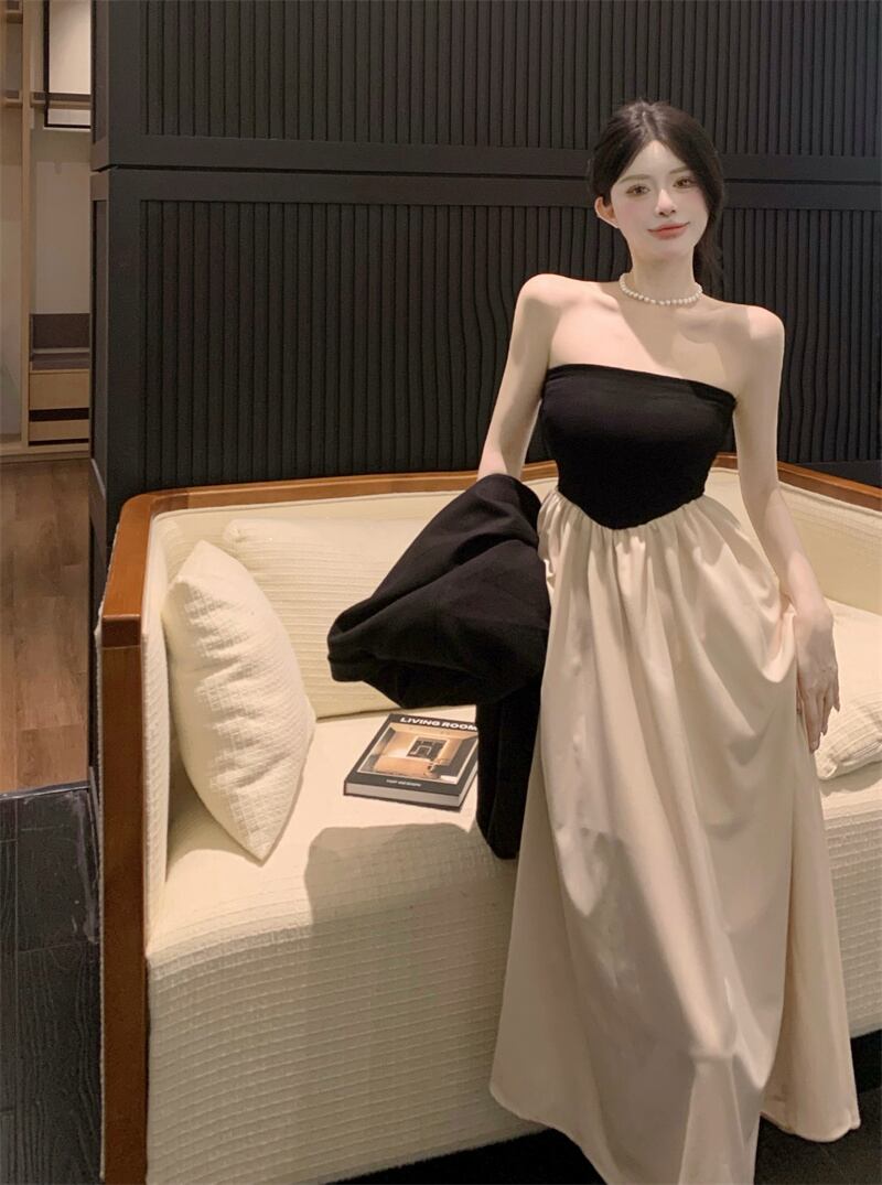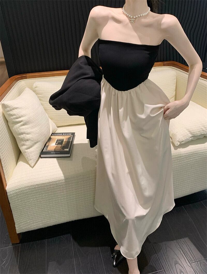 バックレススリムチューブトップウエストドレス女性の夏のハイウエストワンショルダースカートヘップバーンスタイルフレンチミッドレングススカート ハイウェスト サマー 夏物 bstraw55159123092 | beaute25