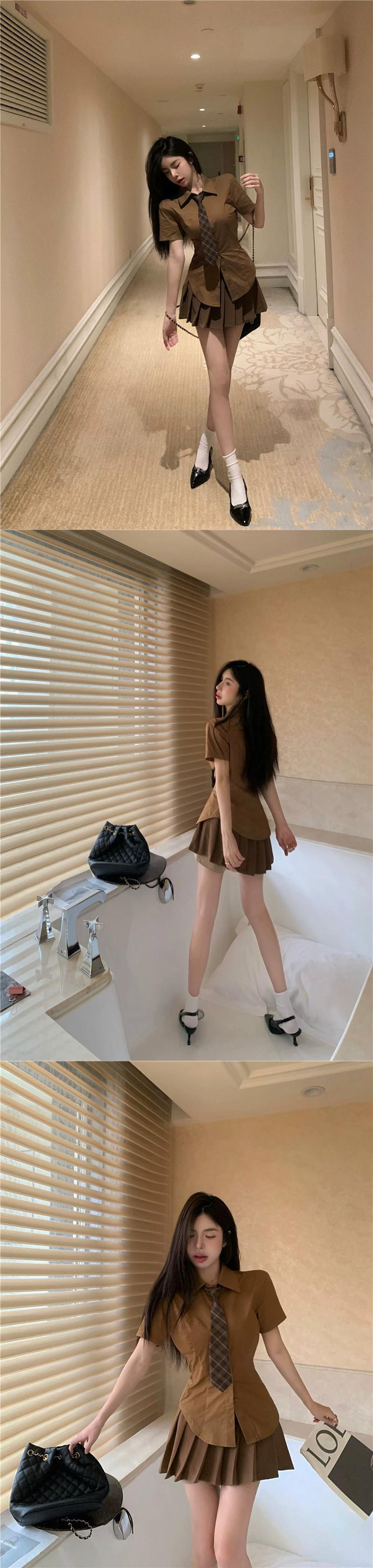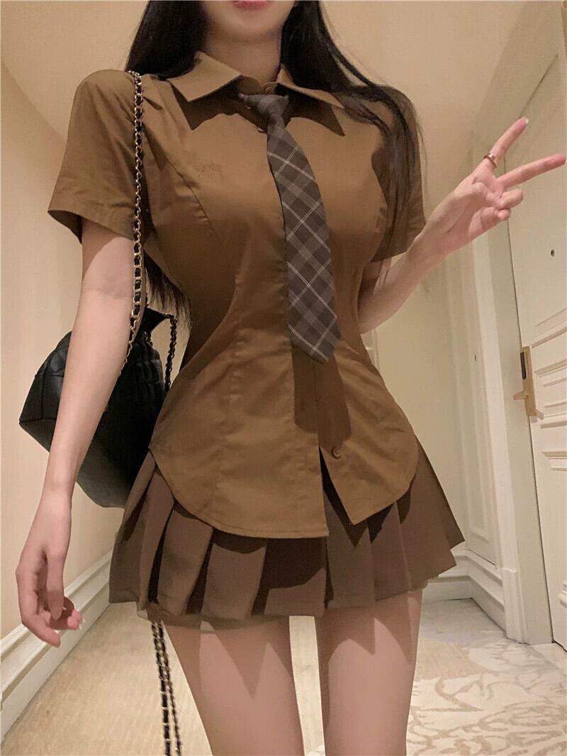 色:ブラウンシャツ+ネクタイ,グレーのシャツ+ネクタイ,グレーのフェイクツーピーススカート,茶色のフェイクツーピーススカート