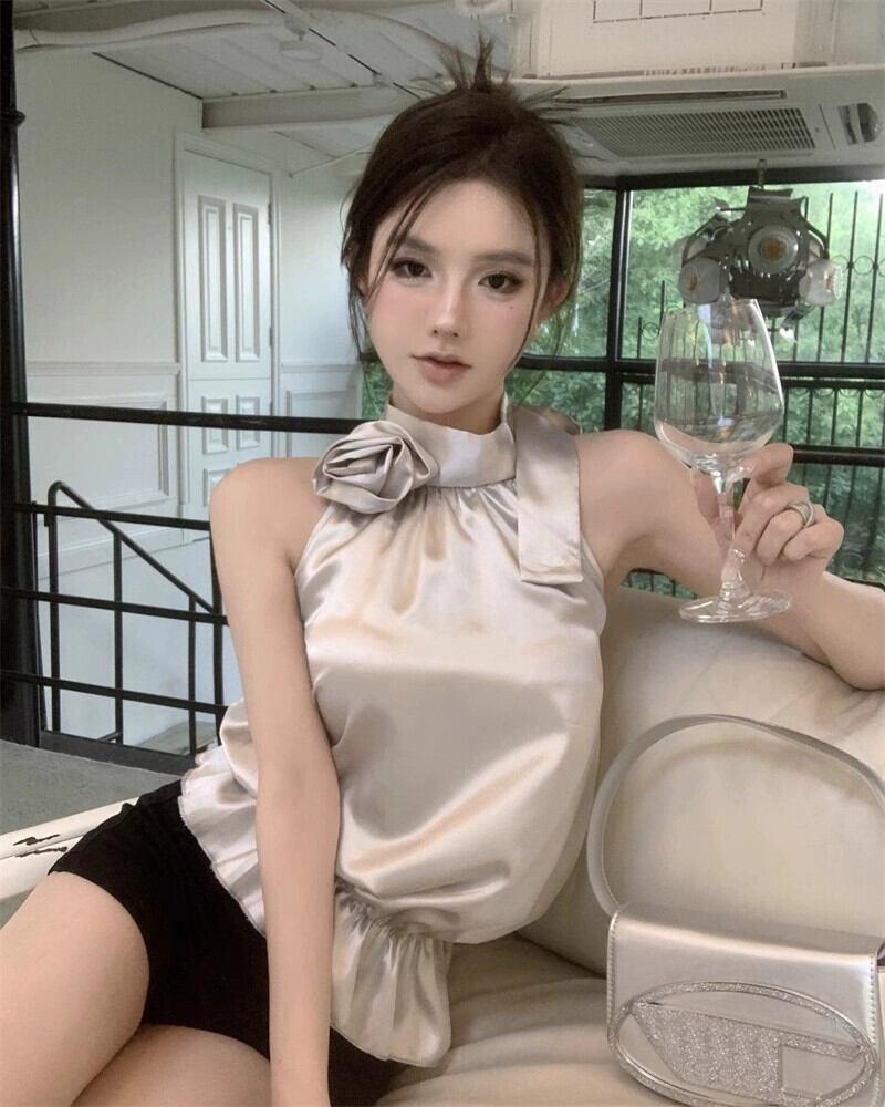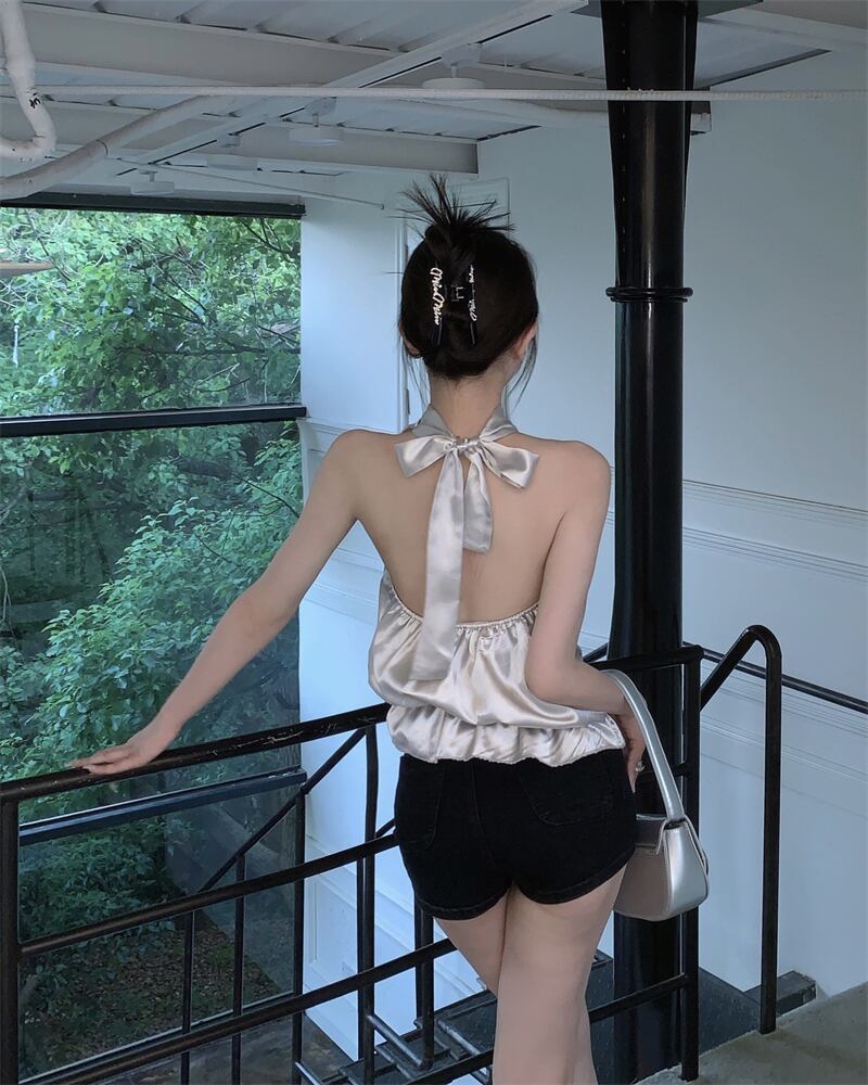 純粋な欲望セクシーなフラワーサテンホルターネックキャミソール女性の夏の弓ノースリーブ薄いオープンバックアウターウェアトップ リボン サマー 夏物 フラワーデザイン bstraw27084823551 | beaute25