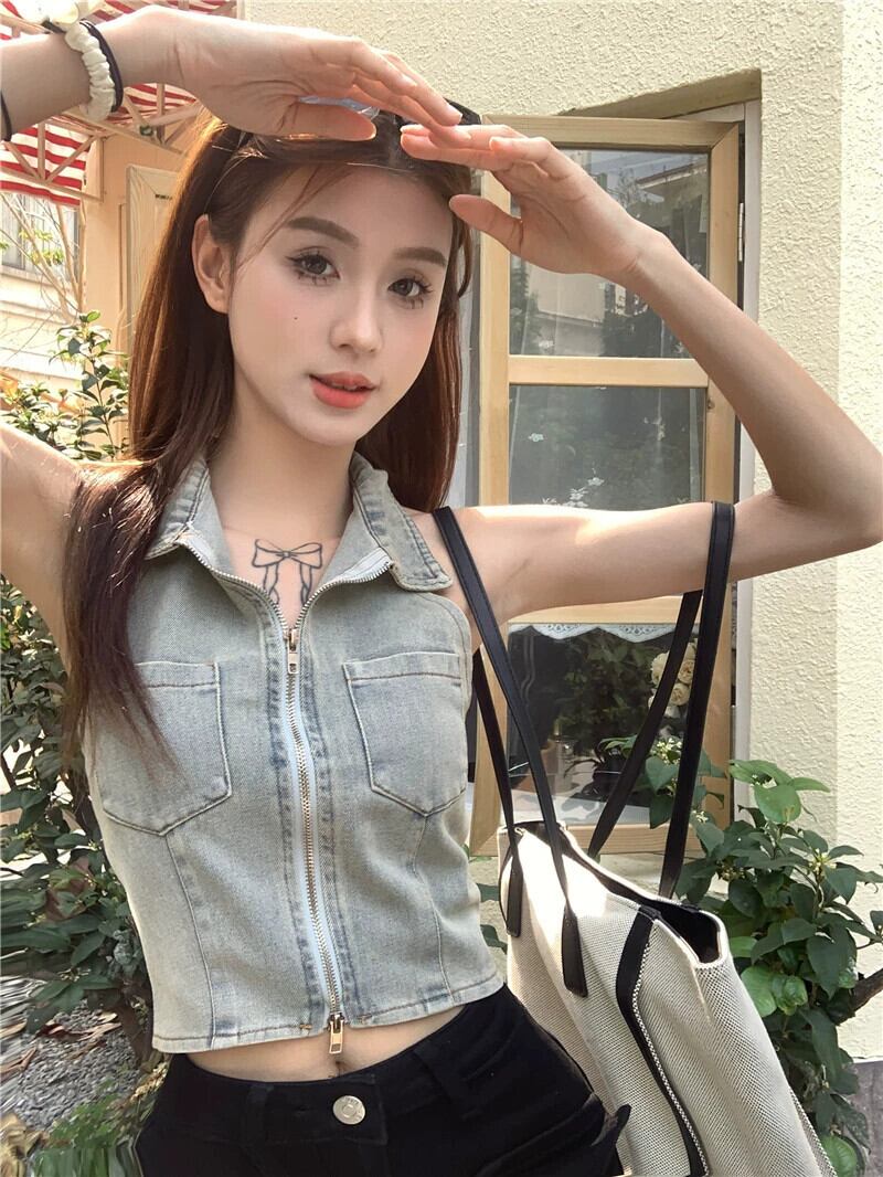 香港スタイルのレトロな吊りネックデニムキャミソールレディース夏ノースリーブジッパーショートデザインセンスニッチジャケットアウター サマー 夏物 bstraw50733980140 | beaute25