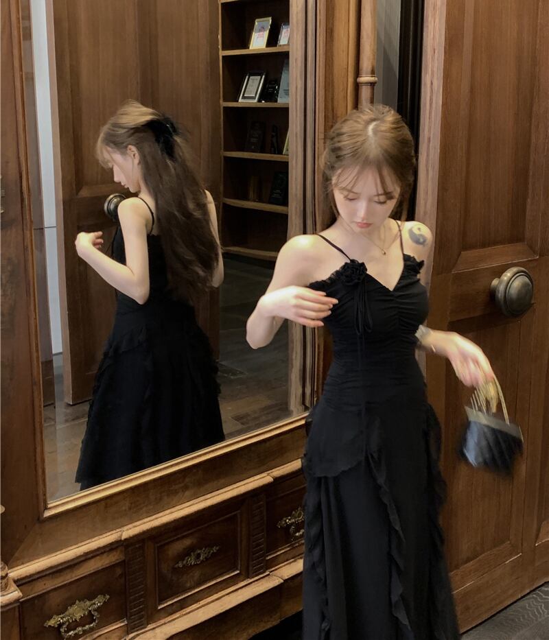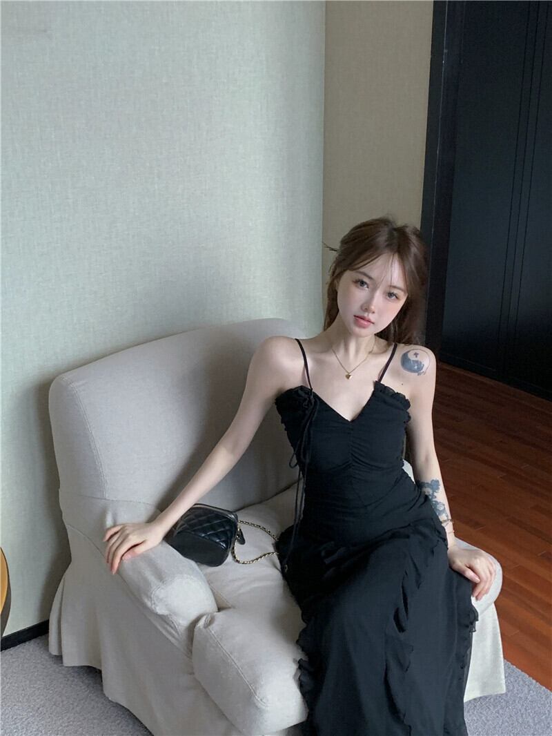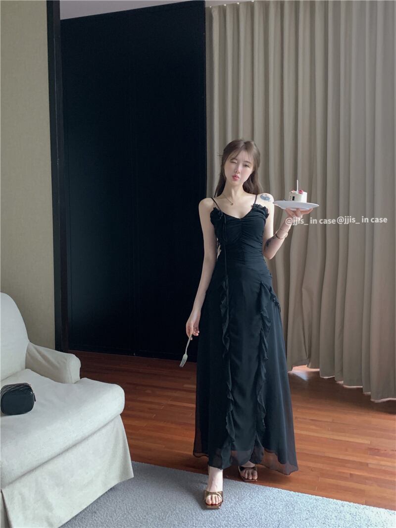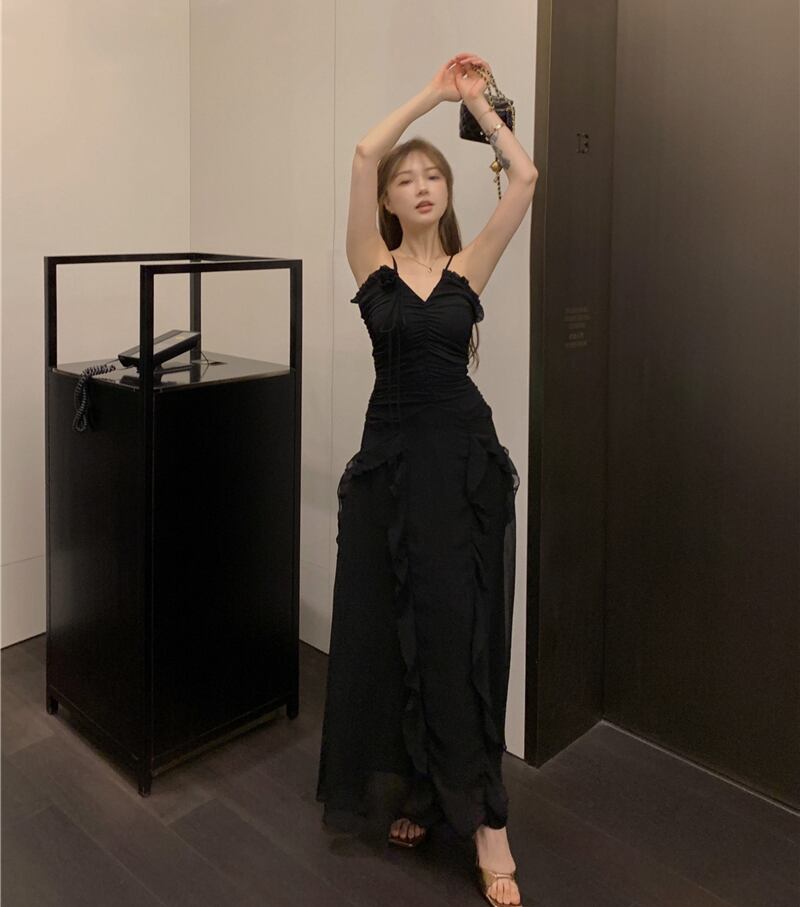 黒の V ネックサスペンダードレスレディースサマースカートスリムフラワー不規則蓮の葉エッジ高品質ロングスカート ブラック 夏物 Vネック フラワーデザイン bstraw7220464200 | beaute25