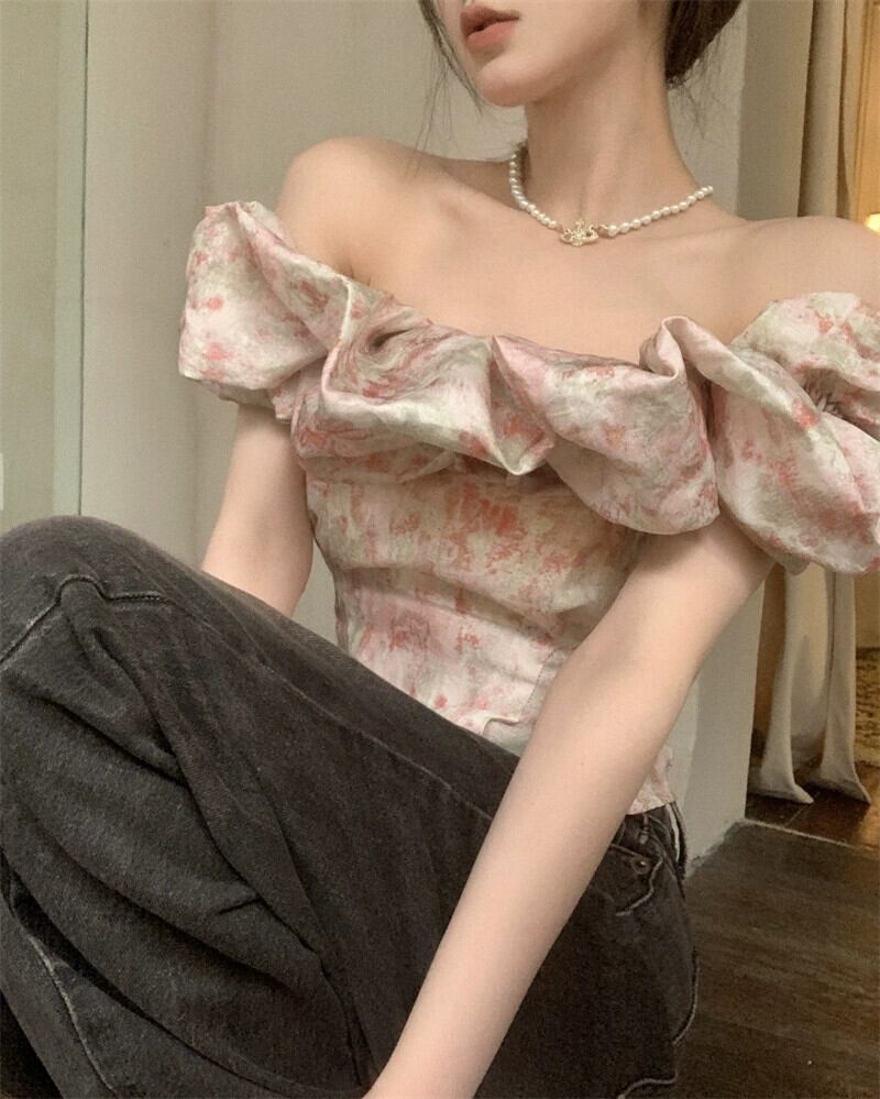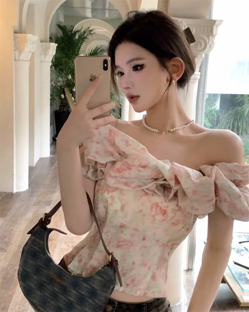 Sweet Spice Girl 花柄半袖シャツ レディース 夏 鎖骨 ユニークなワンショルダー フレンチデザイン ニッチトップ 大人ガーリー スウィート キュート カジュアル サマー 夏物 bstraw32620394553 | beaute25