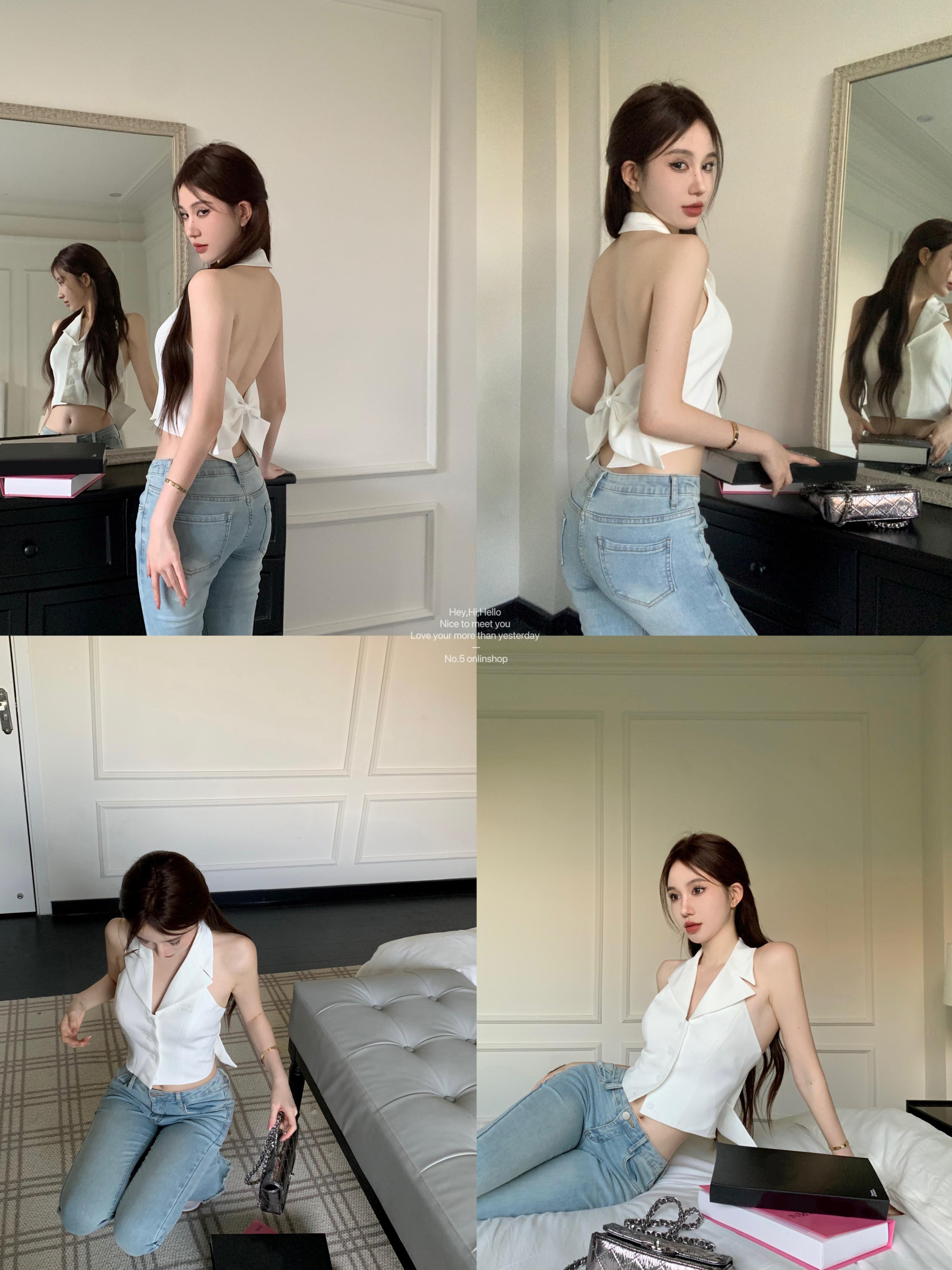 セクシーな白い背中の開いたちょう結びハンギングネックノースリーブシャツ女性の夏ショートスリムフィットニッチ気質シャツトップ ホワイト リボン サマー 夏物 bstraw13981163705 | beaute25