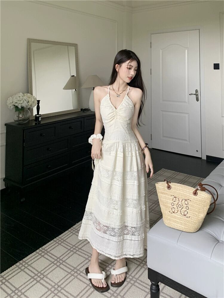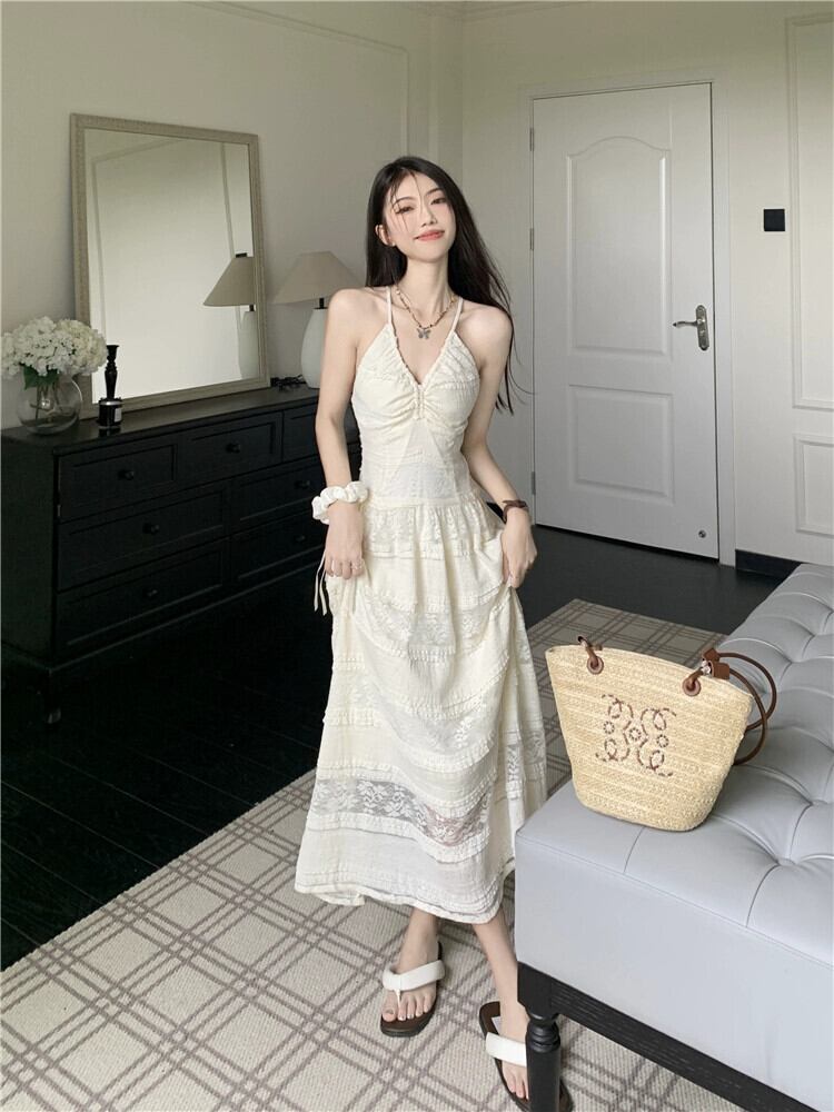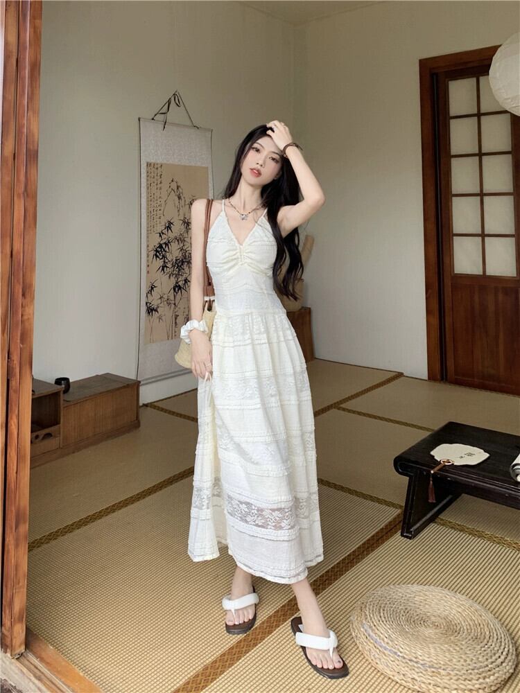 フレンチ V ネックレースサスペンダードレス女性の夏の背中の開いた高品質スカートティーブレイクスカートノースリーブ気質ロングスカート サマー 夏物 Vネック bstraw66129711365 | beaute25