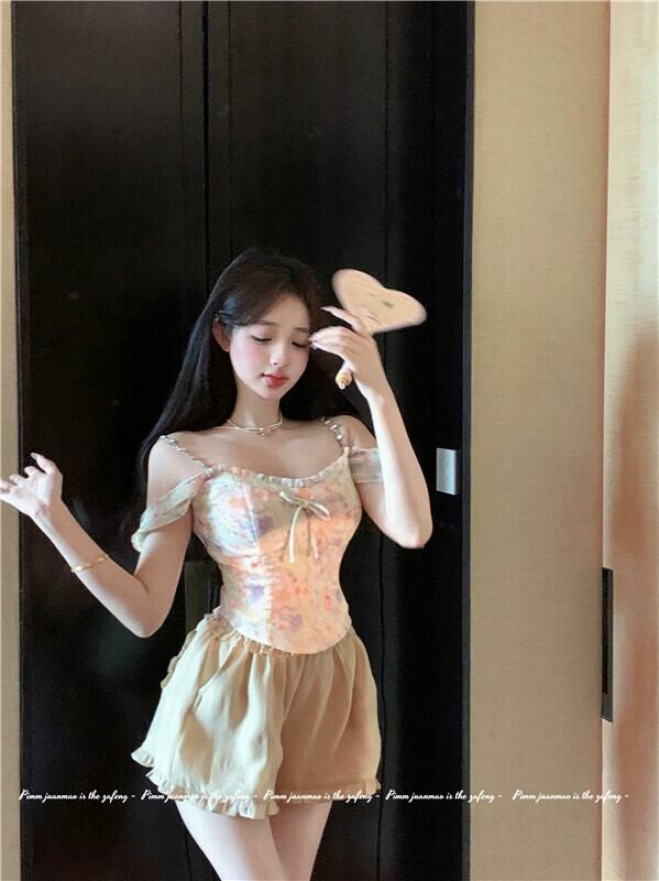 甘いスリムショート花柄チェーンキャミソール小さなベスト女性の夏のアウターちょう結びセクシーな純粋な欲望風トップ リボン 大人ガーリー スウィート キュート カジュアル サマー 夏物 ピュア bstraw68718225612 | beaute25