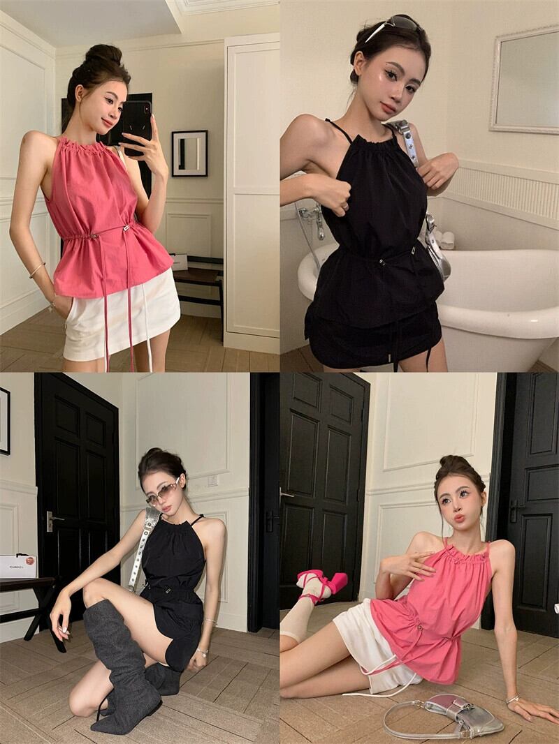 スパイスガールローズピンクホルターネックキャミソール夏純粋な欲望セクシーなアウターウェアレースアップスリムノースリーブホルタートップ サマー 夏物 ピュア bstraw41841484166 | beaute25