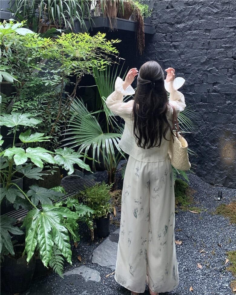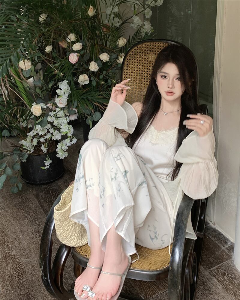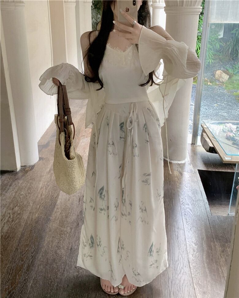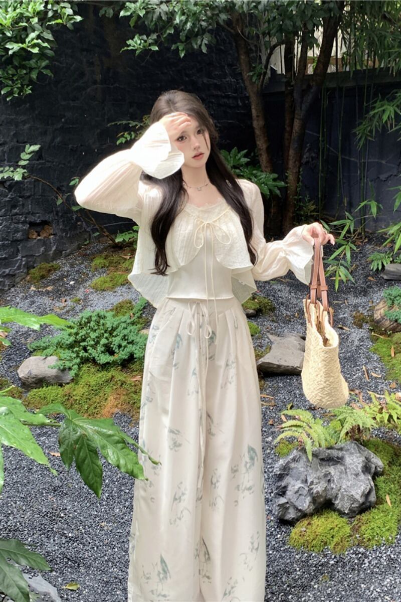 色:レーススリング,インクフラワーパンツ,アプリコットカーディガン