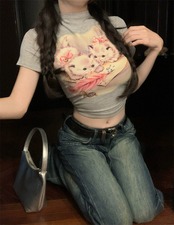 アメリカンキャットプリントノースリーブ弾性ベストトップ女性夏スウィートスパイスガールスリムハーフネックTシャツ エラスティック 伸縮 大人ガーリー キュート カジュアル サマー 夏物 bstraw24297874381 | beaute25