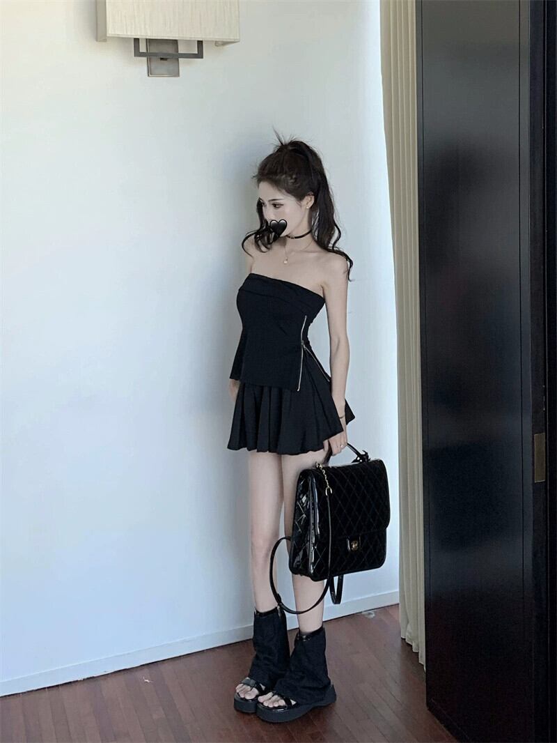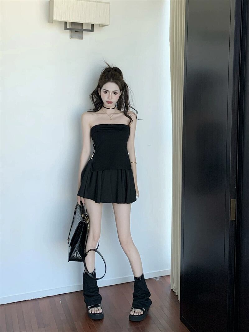 甘くてクールなスーツセクシーな黒のチューブトップベストトップ女性の夏アメリカンフラワーバッドキュロットスカートツーピースセット ブラック 大人ガーリー スウィート キュート カジュアル サマー 夏物 フラワーデザイン bstraw73693645426 | beaute25