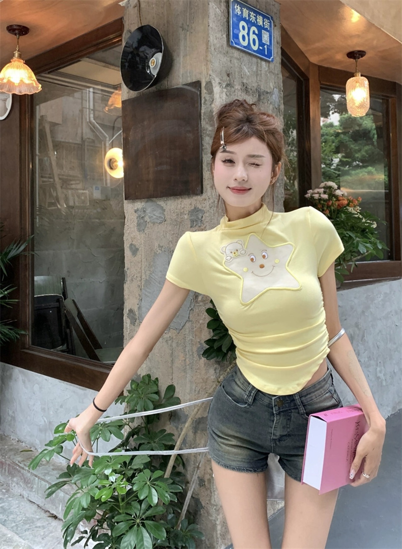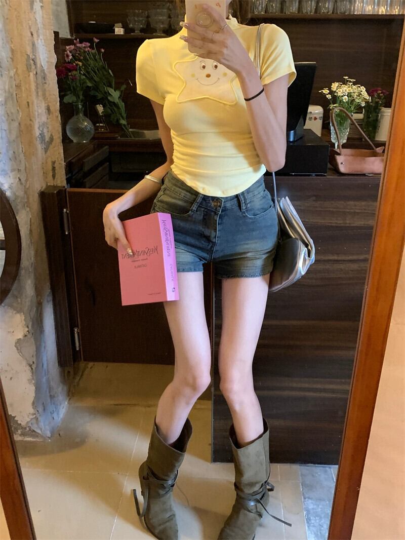 純粋な欲望スタイルハーフハイカラー半袖Tシャツレディース夏かわいいカーブ裾スリムスターショートトップ 大人ガーリー スウィート キュート カジュアル サマー 夏物 bstraw96833571920 | beaute25