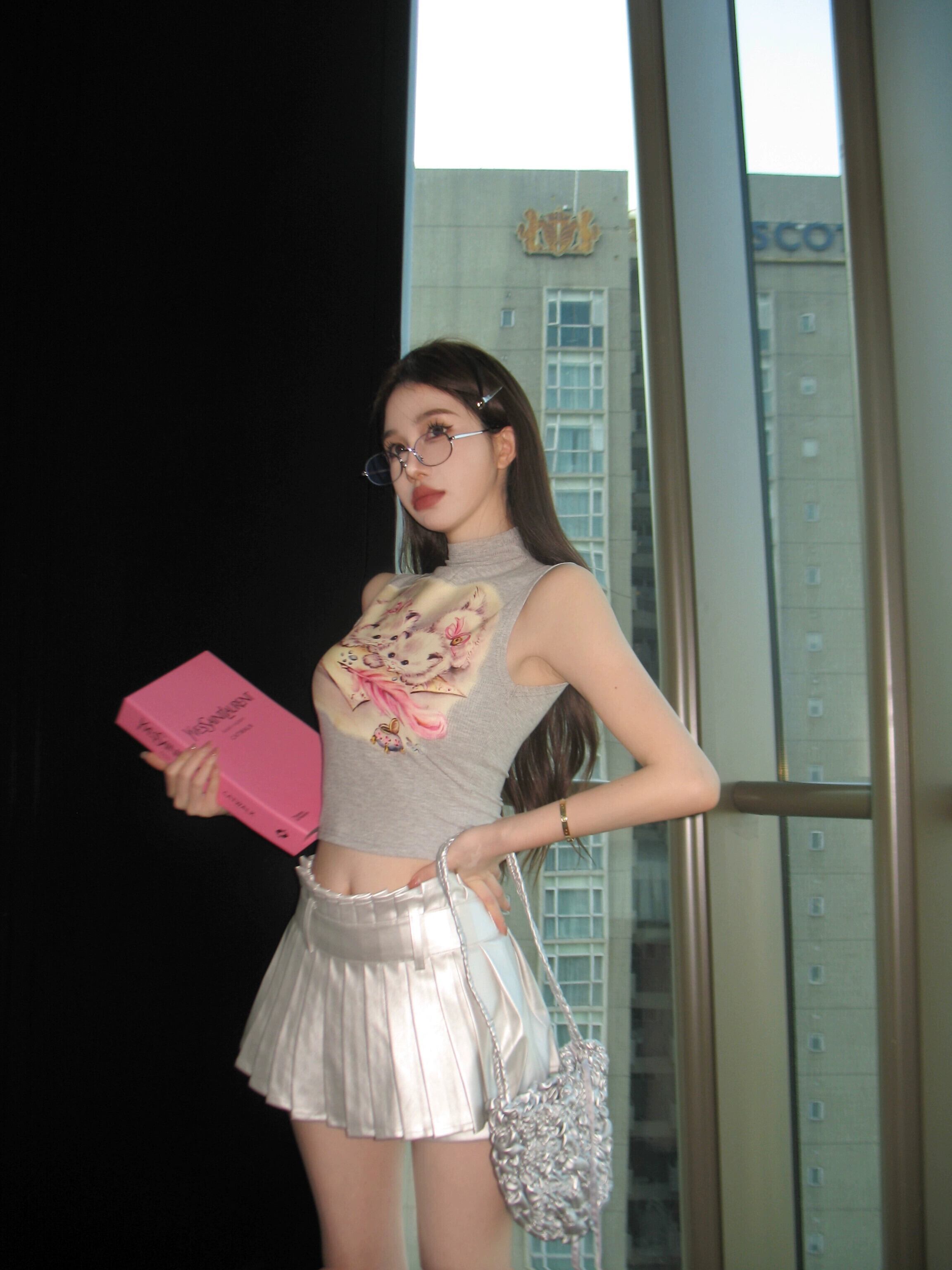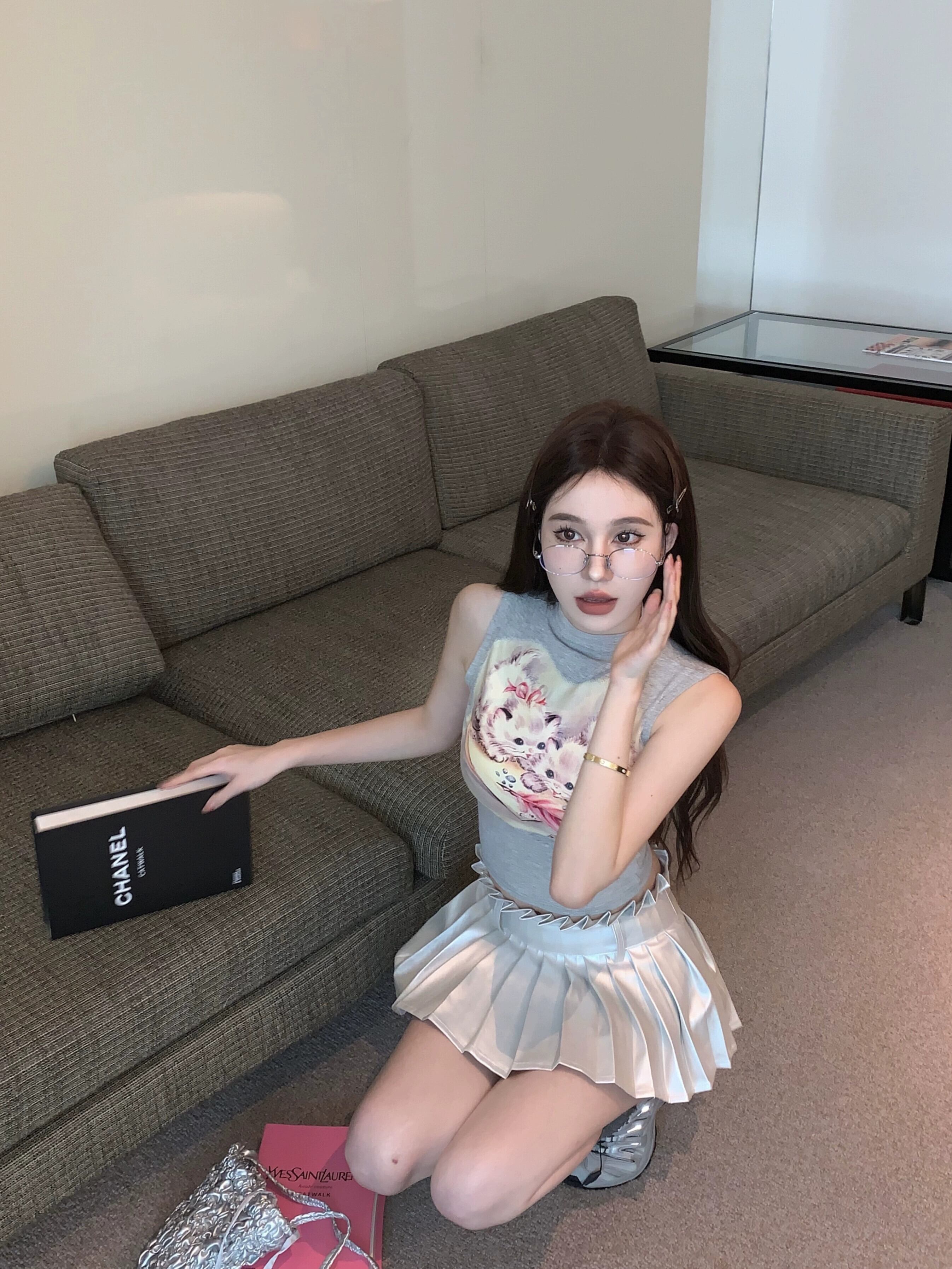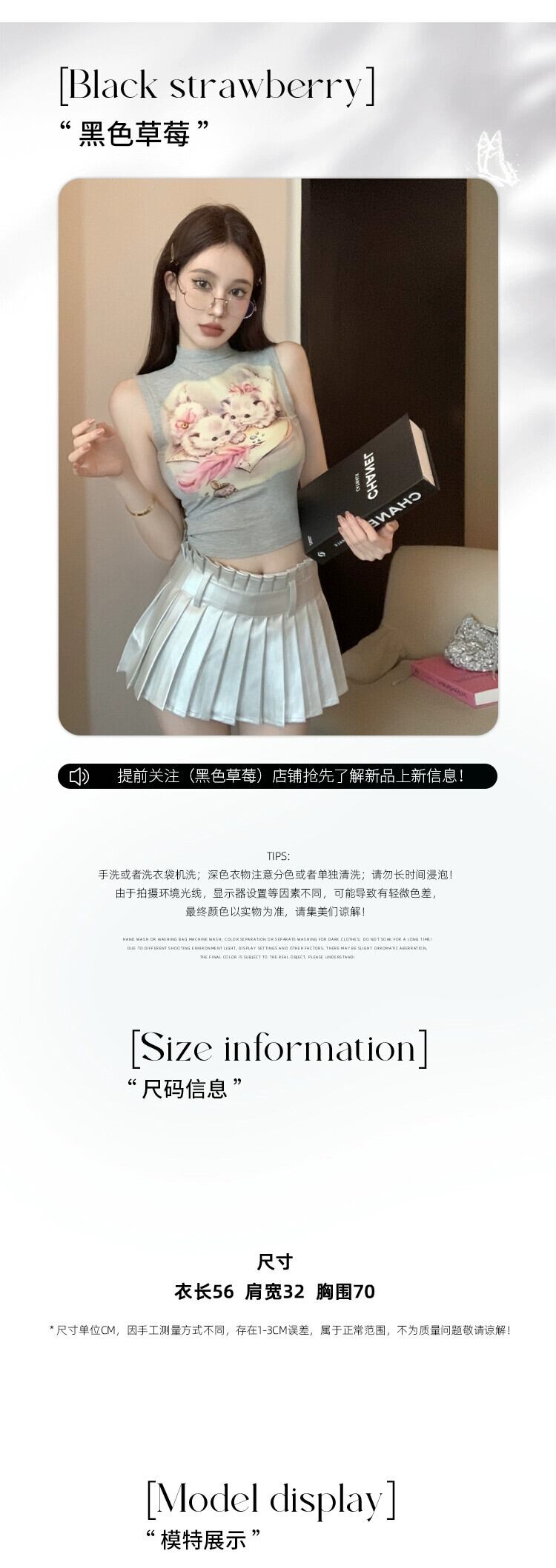 スリムハーフハイカラー猫プリントトップレディースサマーデザイン甘いオールマッチノースリーブタイトベストTシャツ 大人ガーリー スウィート キュート カジュアル 夏物 bstraw69555993534 | beaute25