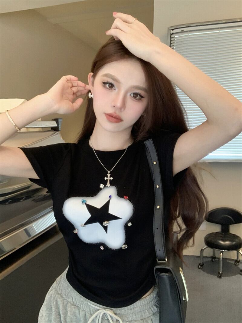 黒の重工業ラインストーンプリント半袖 Tシャツ女性の夏の甘いデザインセンスニッチ小さなショートトップ ブラック 大人ガーリー スウィート キュート カジュアル サマー 夏物 bstraw49289686055 | beaute25