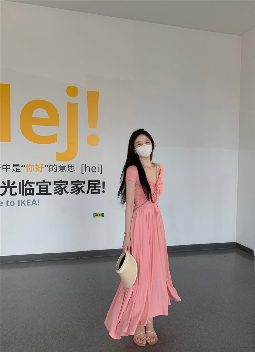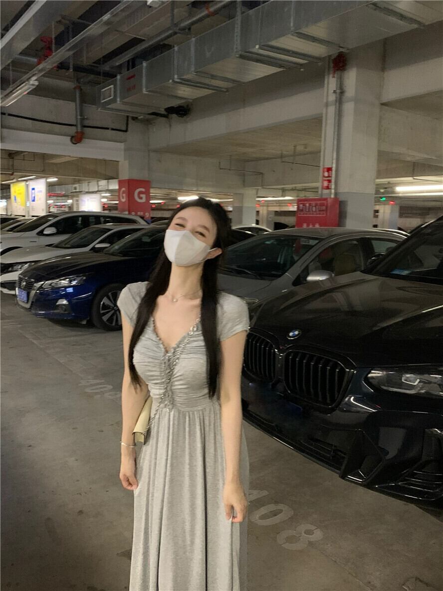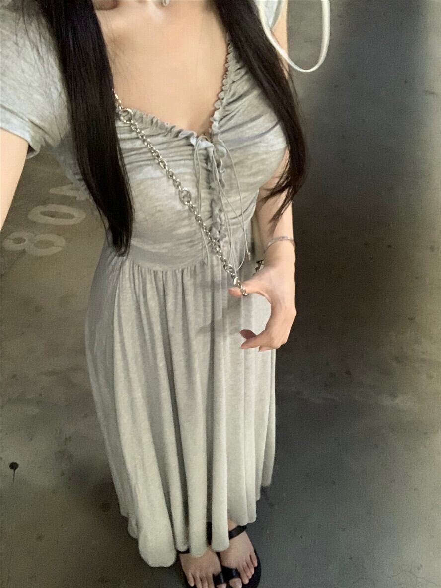 フレンチプリーツ V ネックドレスレディース夏スリムウエストグレー A ラインスカート高品質ネクタイセクシーなロングスカート サマー 夏物 Vネック Aライン bstraw27017195384 | beaute25