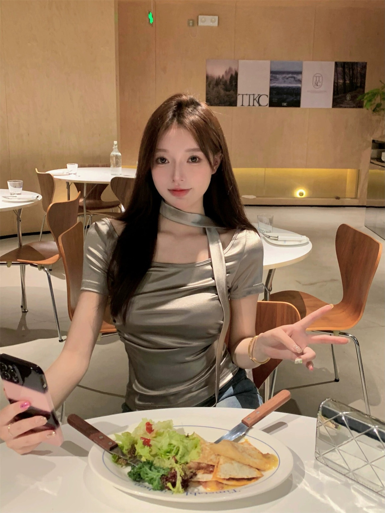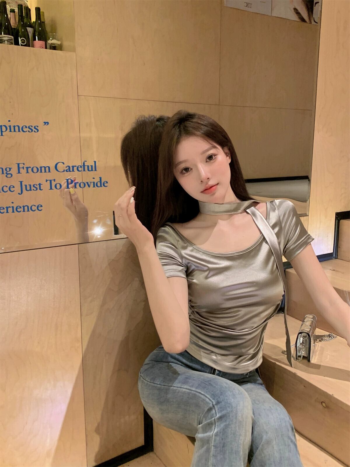 スパイスガール シルバー フロントショルダー 半袖 Tシャツ レディース 夏感 ニッチ ホルターネック 鎖骨折り スリム ショート トップス サマー 夏物 銀 bstraw70393679173 | beaute25