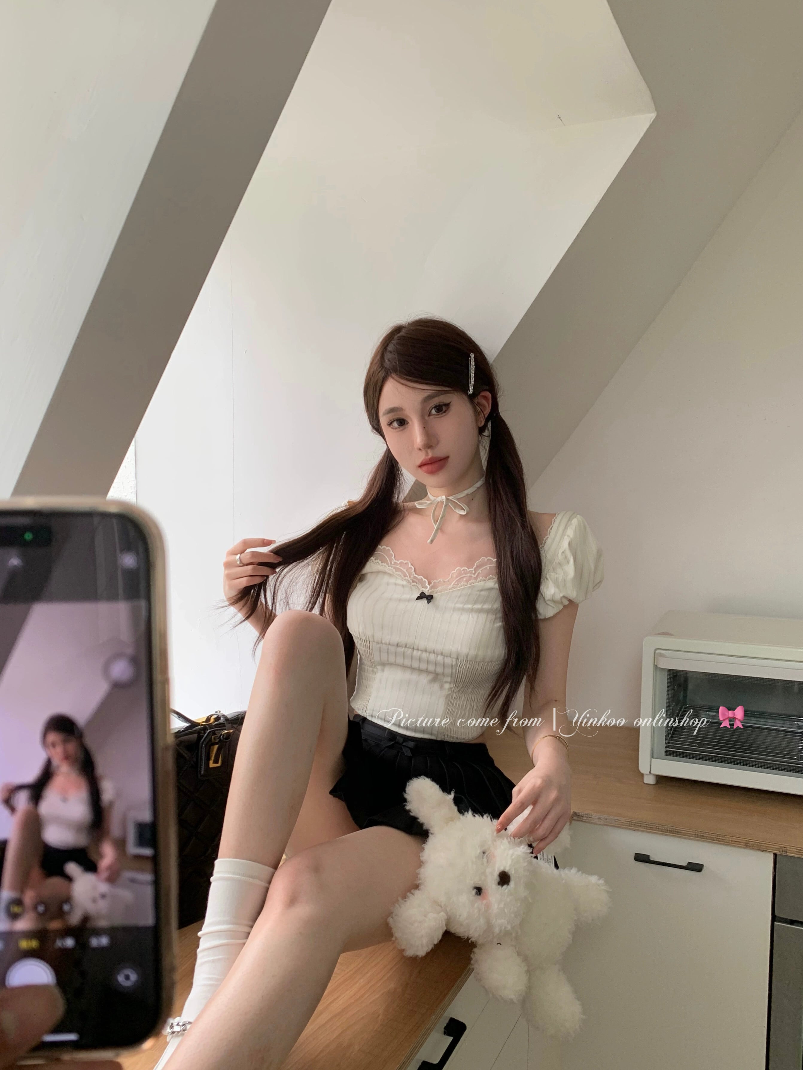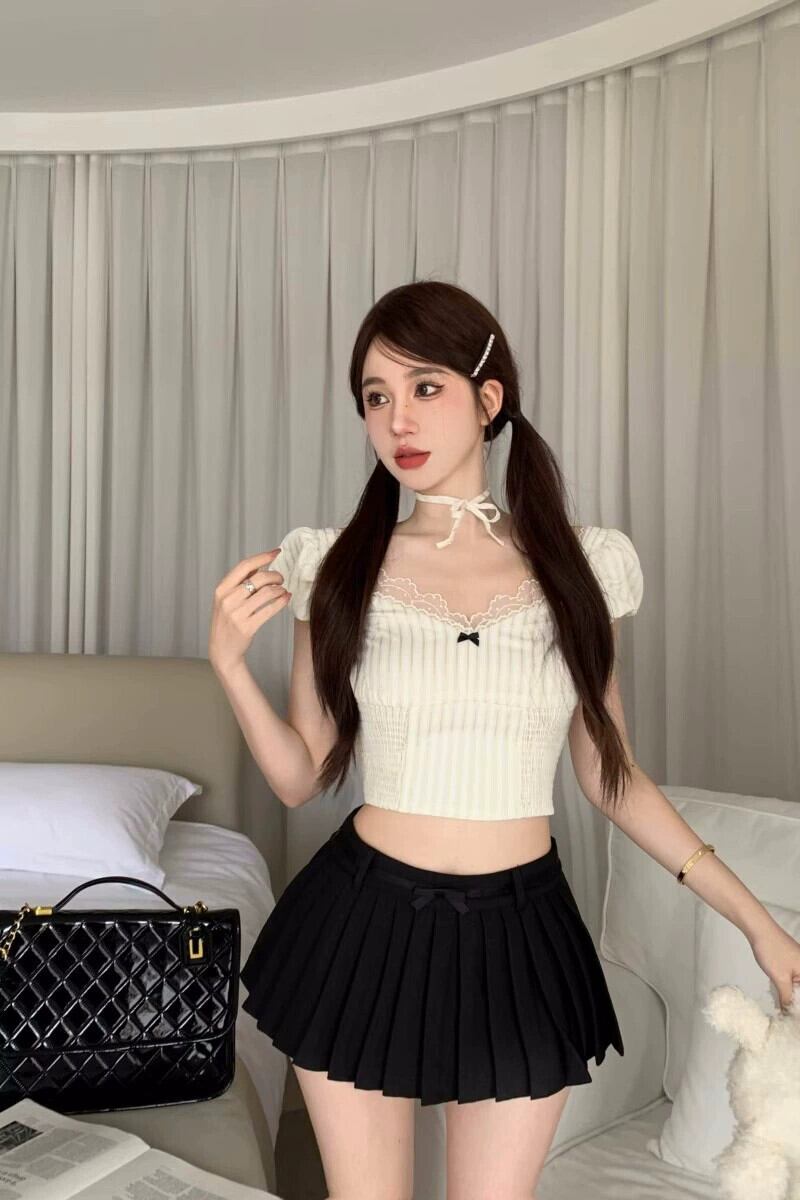 色:チェックレースシャツ,リボンプリーツスカート