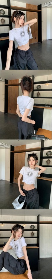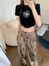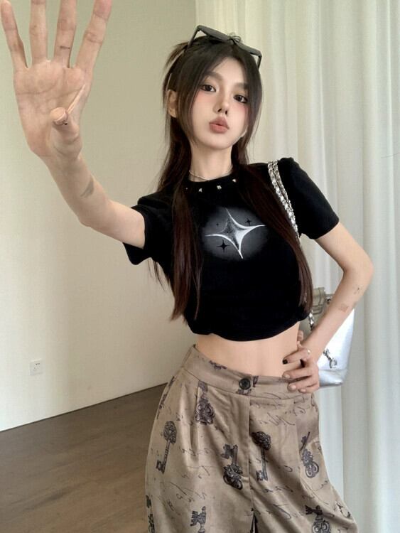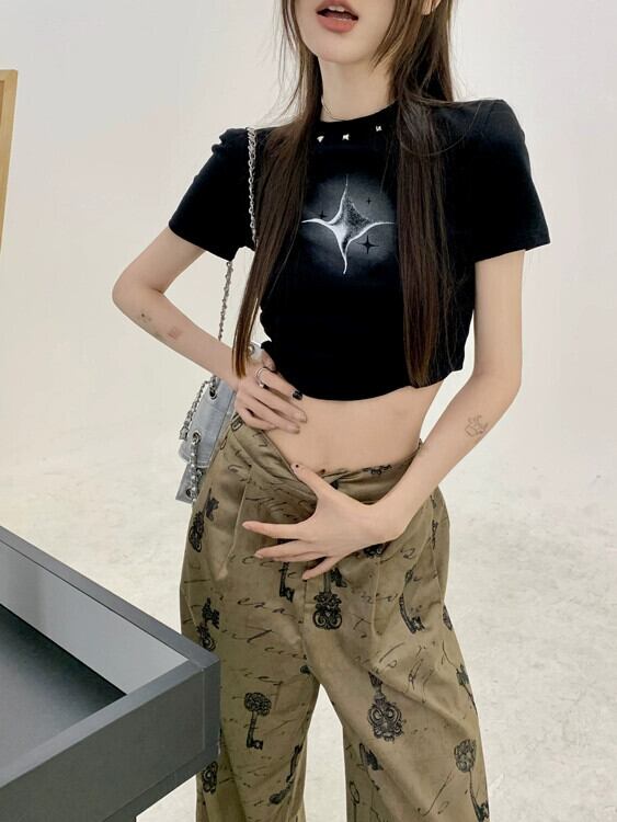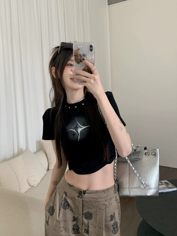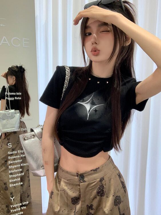 アメリカンレトロプリント黒半袖Tシャツレディース夏スリムフィットしわ甘いへそショートトップ ブラック 大人ガーリー スウィート キュート カジュアル サマー 夏物 bstraw89445274898 | beaute25