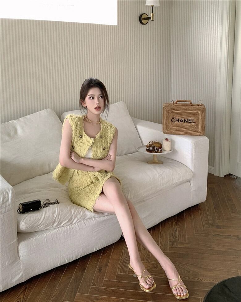 小さな香りの風スーツフレンチノースリーブベストベスト女性の夏のハイウエストスリットバッグヒップスカート黄色のツーピーススーツ ハイウェスト サマー 夏物 bstraw60183320375 | beaute25