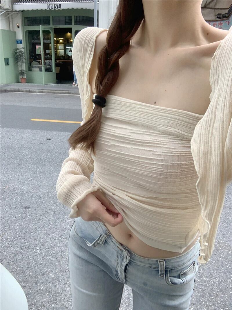 甘いスーツ短い薄いセクション日焼け止め小さなカーディガンジャケット女性の夏のシックなチューブトップベストトップ 2 点セット ショート 大人ガーリー スウィート キュート カジュアル サマー 夏物 bstraw68777897674 | beaute25